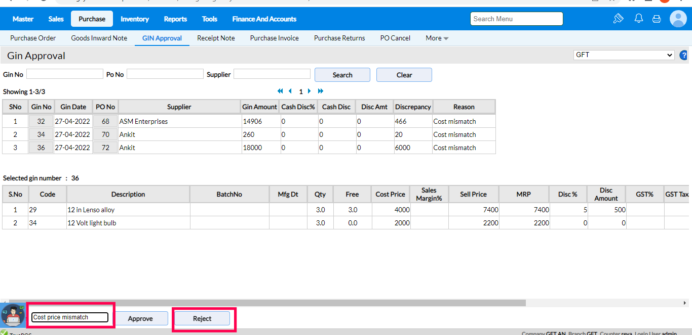 If there is any mismatch in Tax, Qty, or Cost price which you are not aware of then you can Reject the GIN in the GIN Approval screen by entering appropriate remarks.