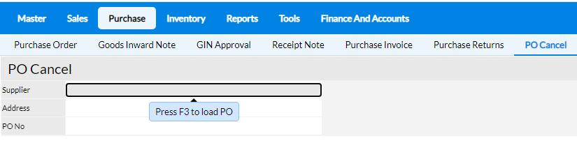 2. The PO Cancel page is displayed where you have to load the PO Cancel page with