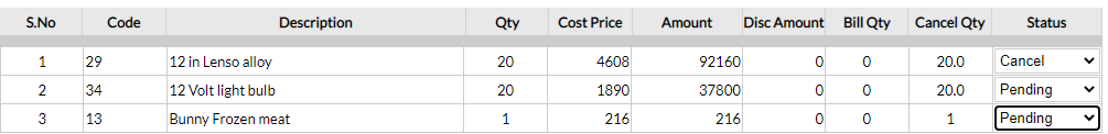 4. The Purchase Order is displayed with the status 'Pending ' or 'Cancel'. Select 'Pending' to save the Purchase Order for the future or 'Cancel' to remove the item from