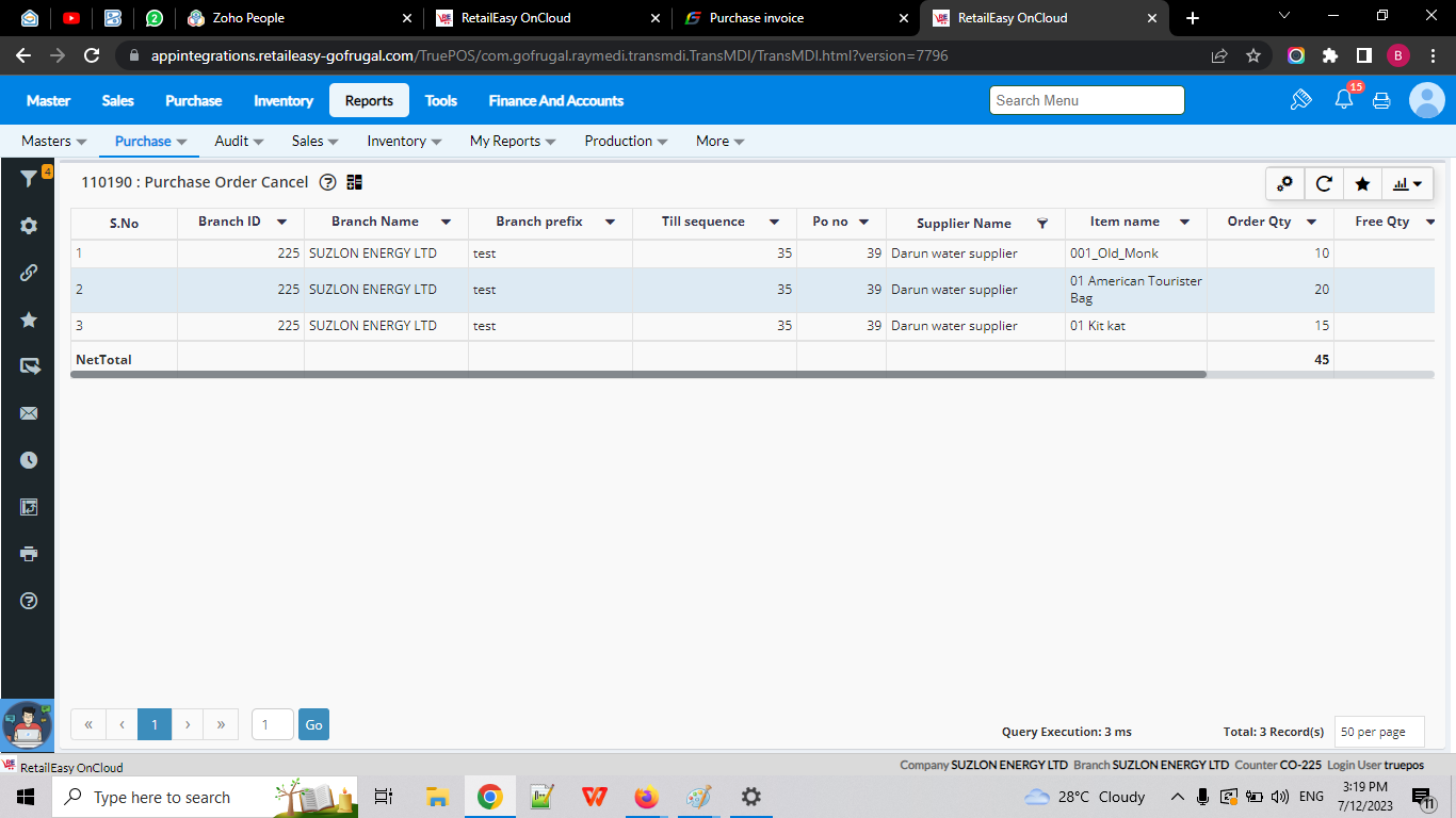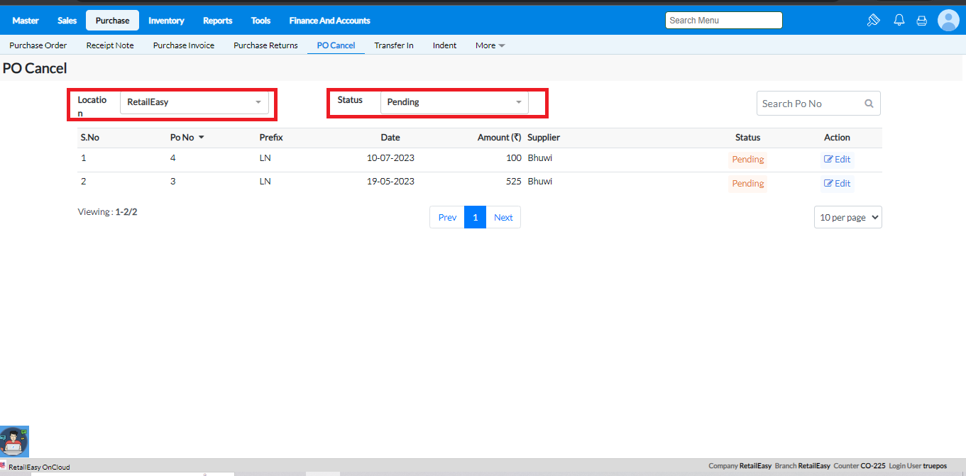 Menu Access: Click Purchase > PO Cancel.