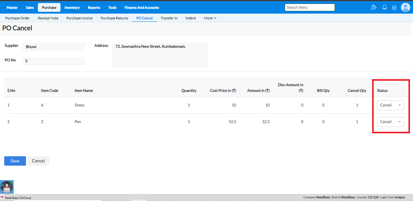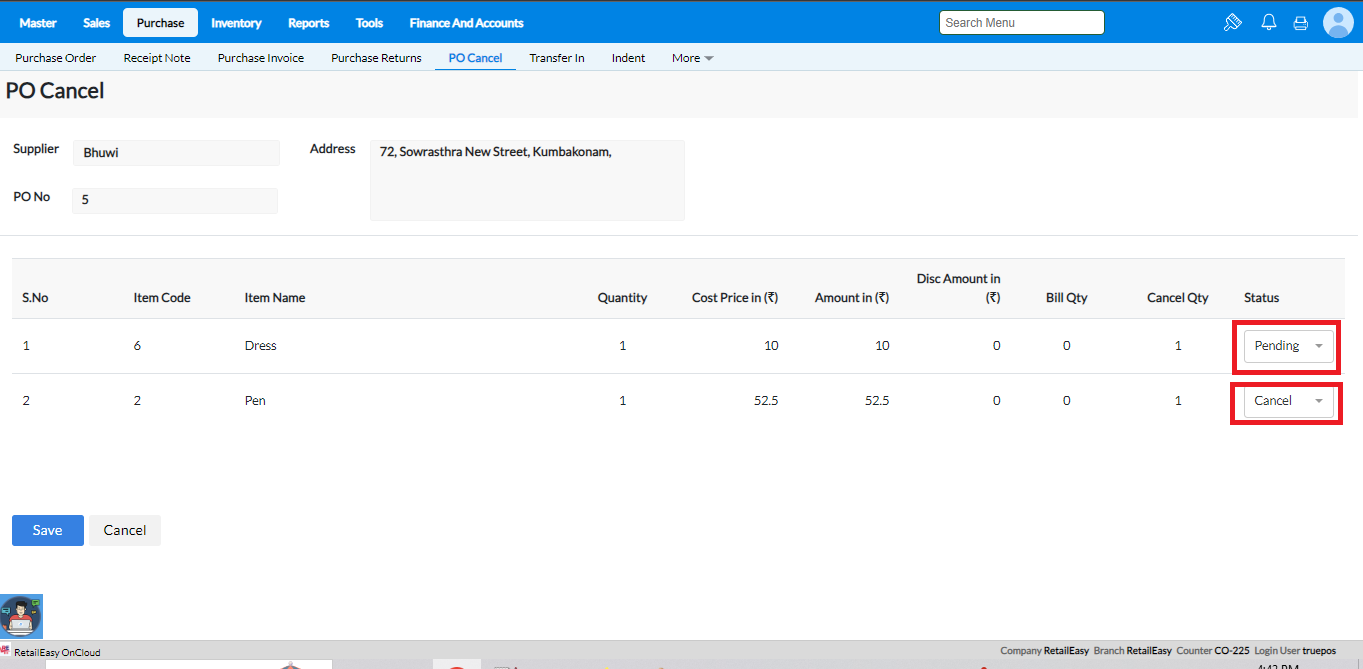 The PO Cancel screen helps you cancel one or more items in a PO or the PO itself, when you are sure that you will not receive stocks against the PO.