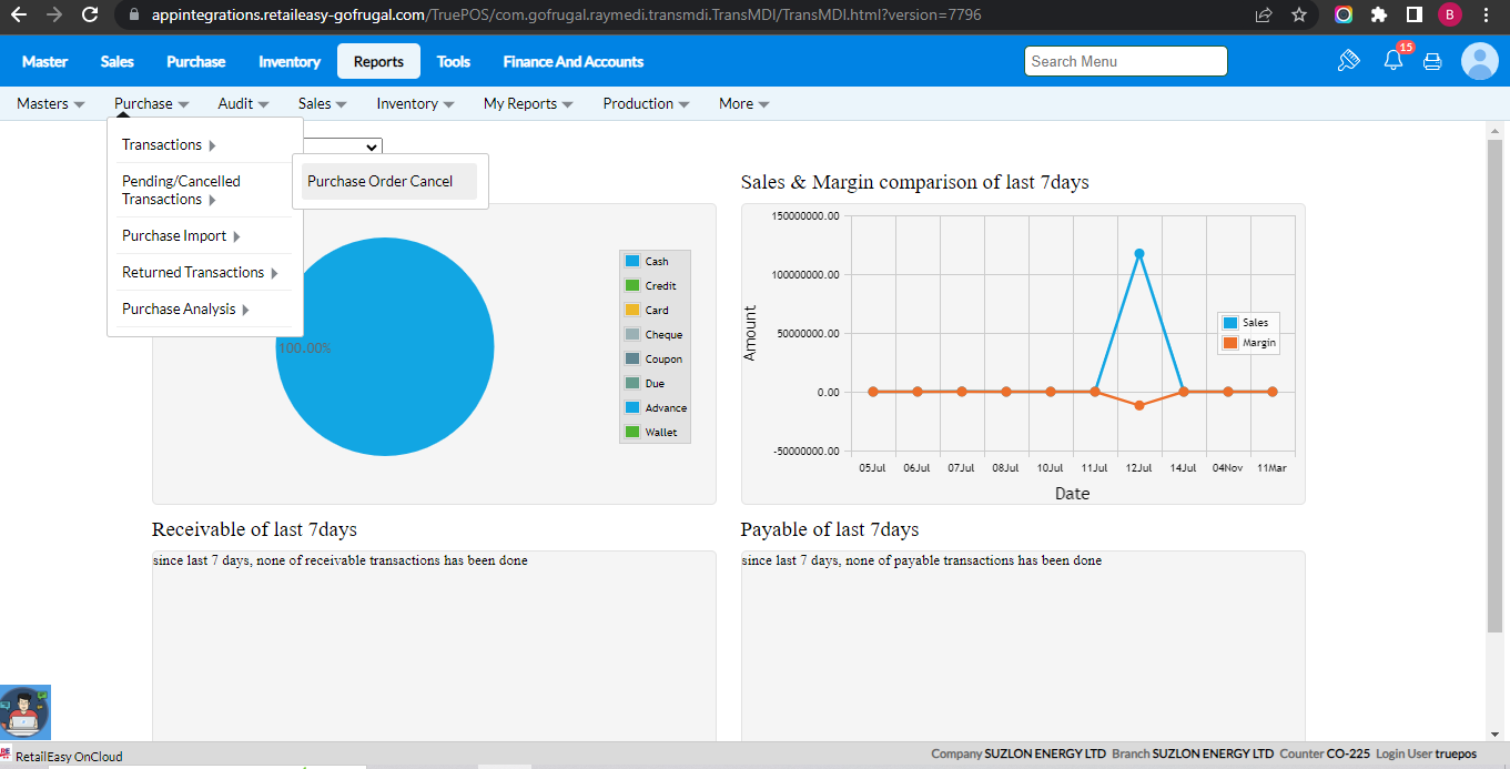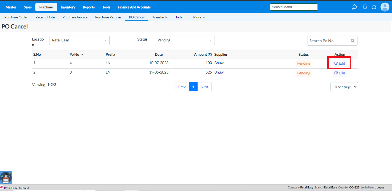 Click Reports > Purchase > Pending/Cancelled Transactions to view the list of cancelled POs.