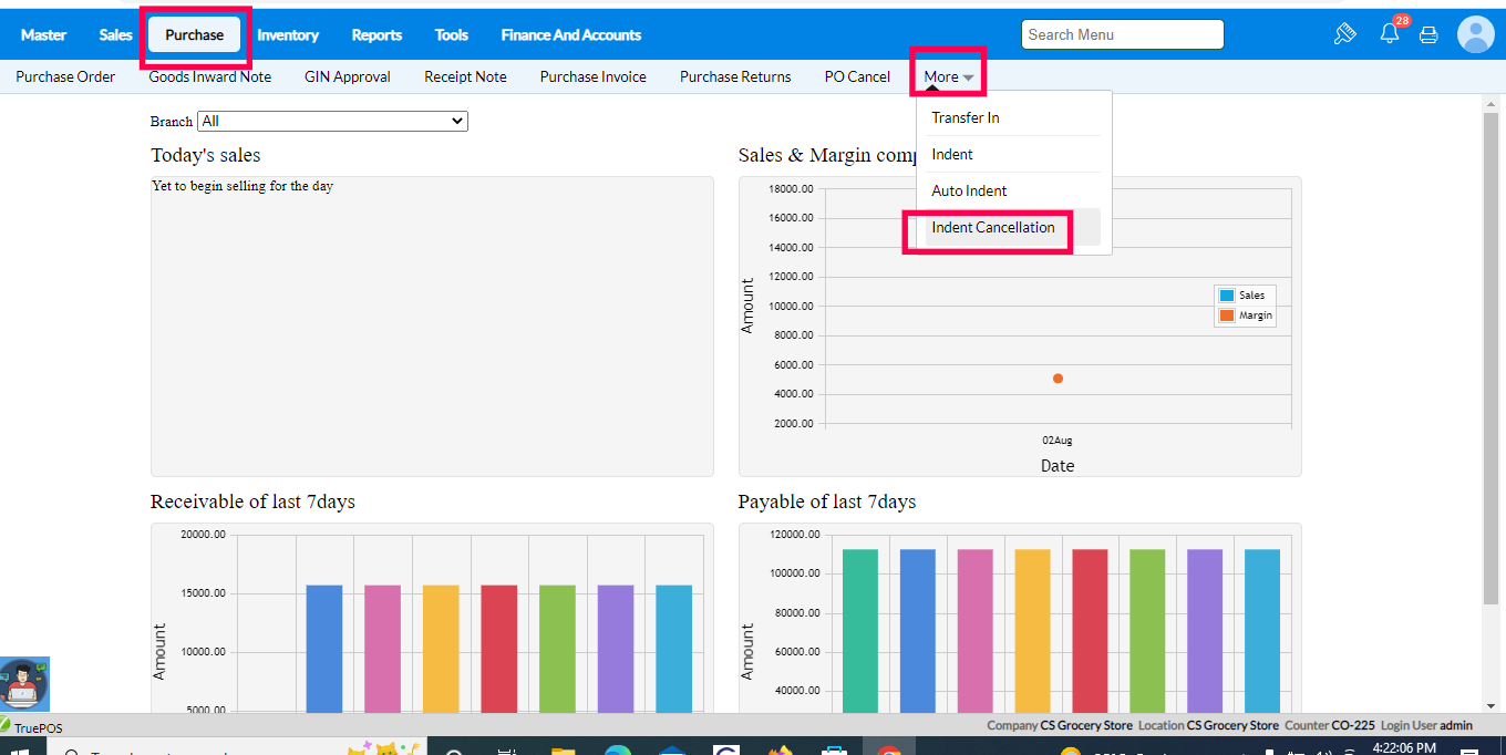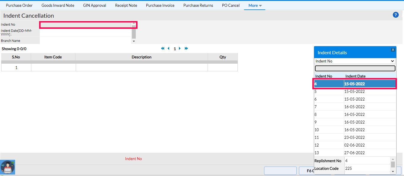 - Once the Indents are canceled they don't appear in the Load Indent option of the Purchase Order screen, thus giving accountability for the items available