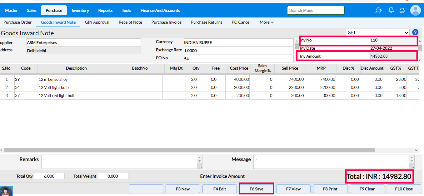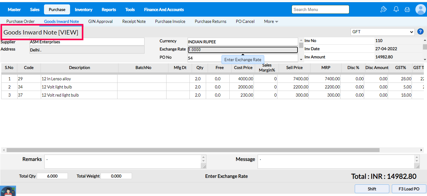 1. To view the created Goods Inward Notes click on F6View.