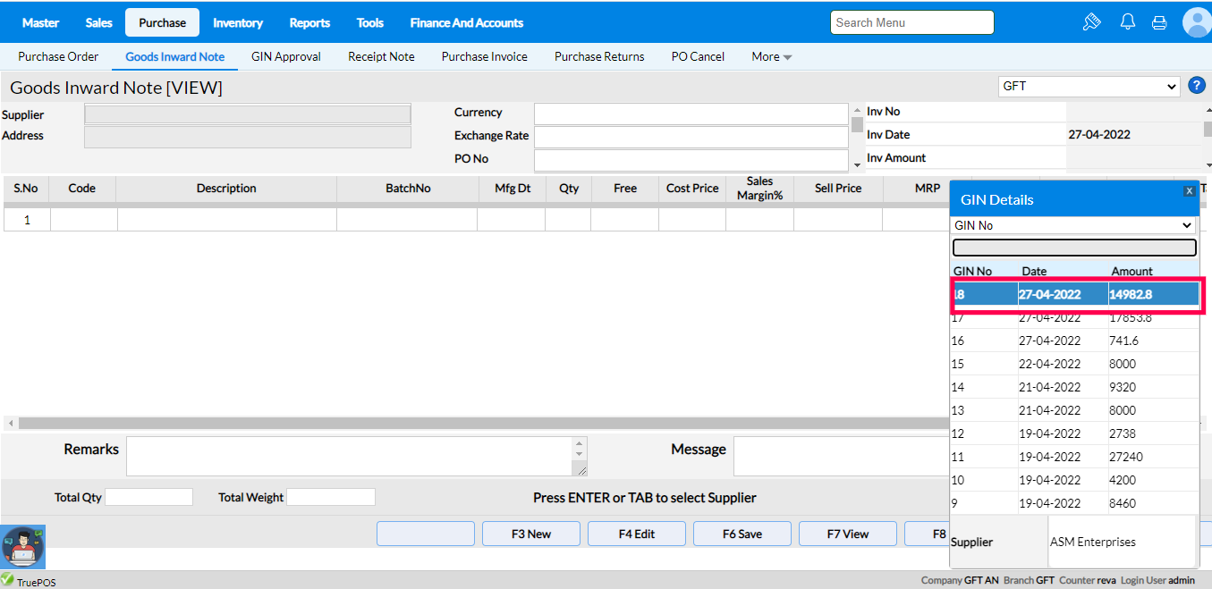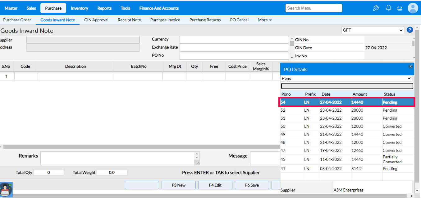4. Select the Purchase Order you need to create a Goods Inward Note and press Enter