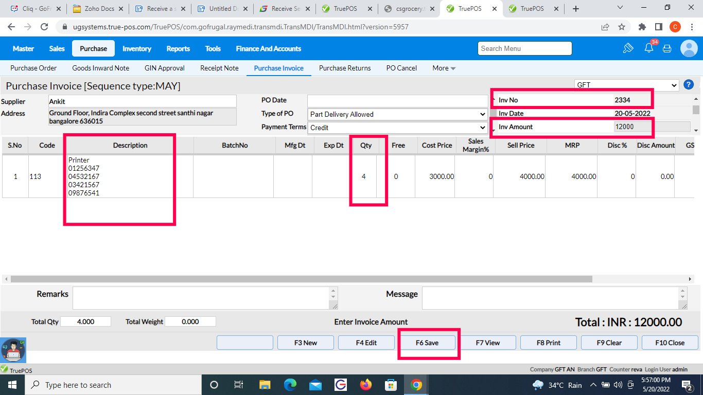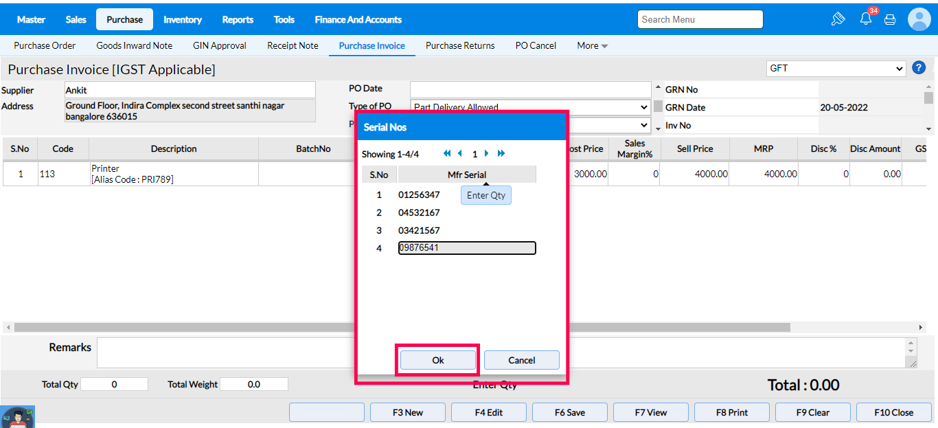 7. As I have entered serial numbers of 4 items as furnished by the Supplier the Qty will