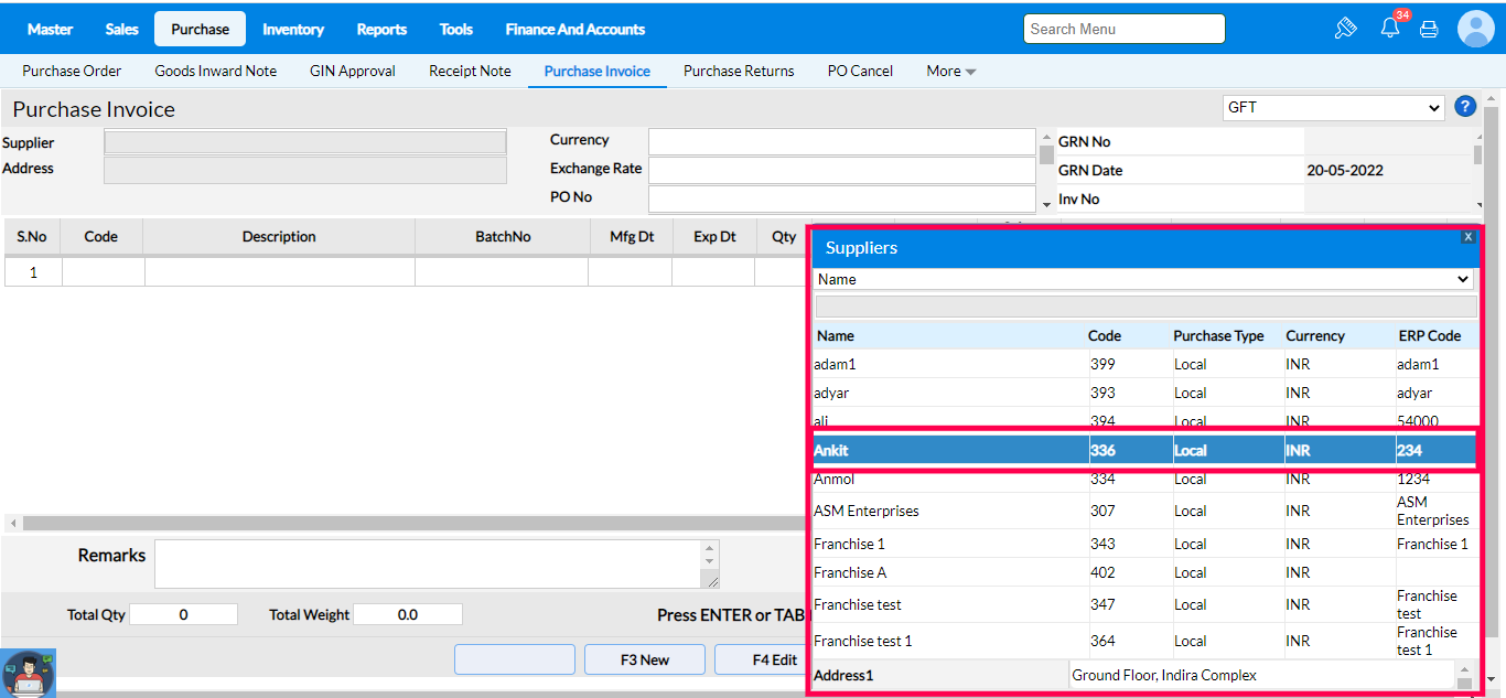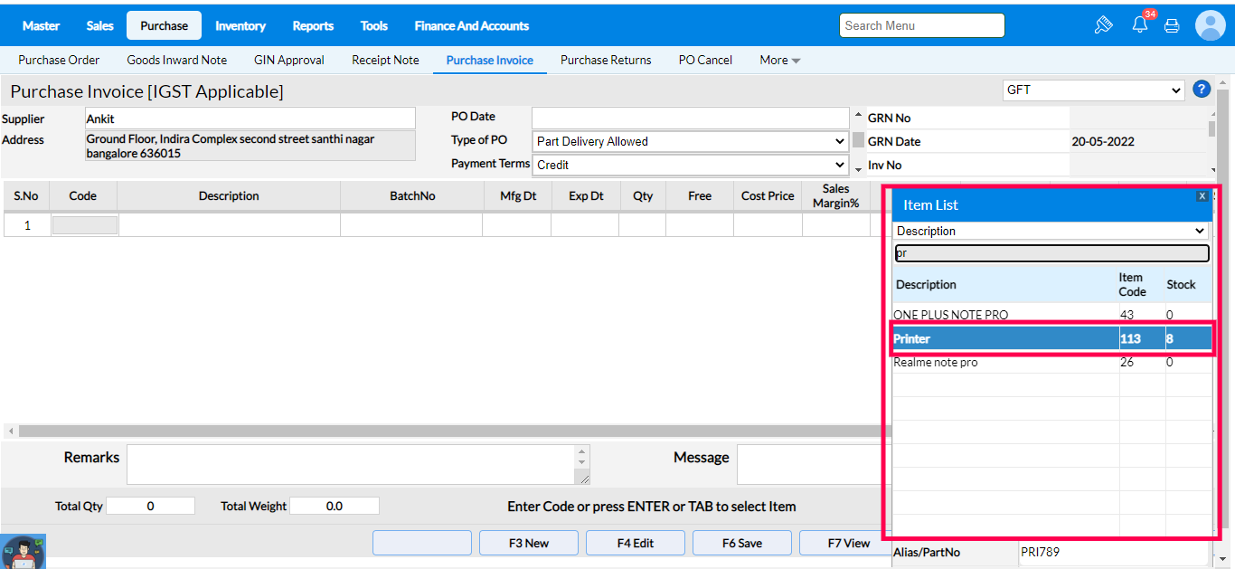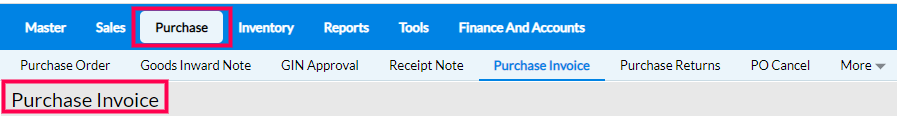 1. Goto Purchase >> Purchase Invoice. The Purchase Invoice screen appears
