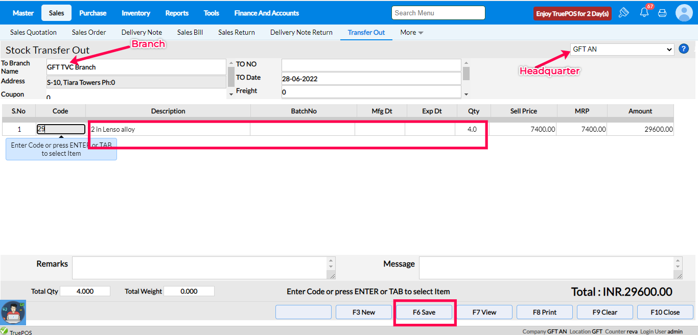 5. Goto Sales >> Transfer out. The Transfer Out screen appears. Select the Headquarter