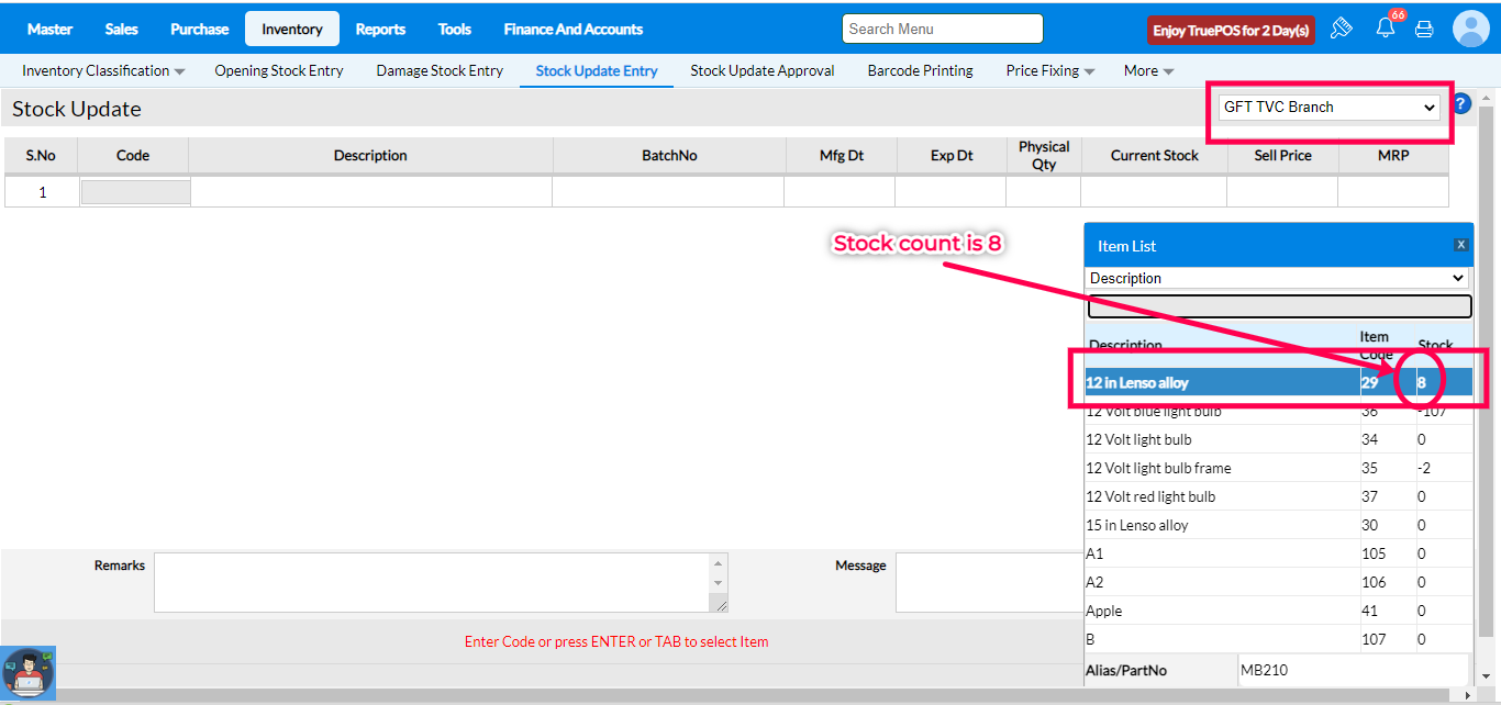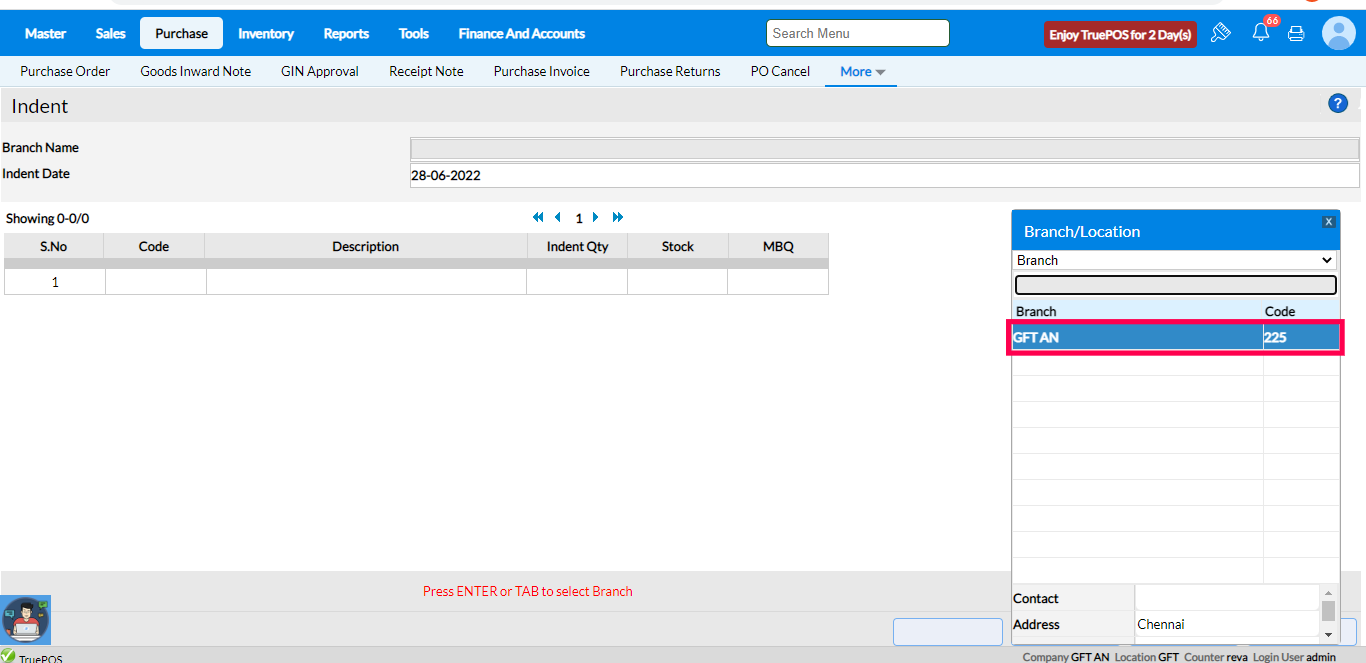 1. Let us first check the stock count of the Indent item in the Branch before creating