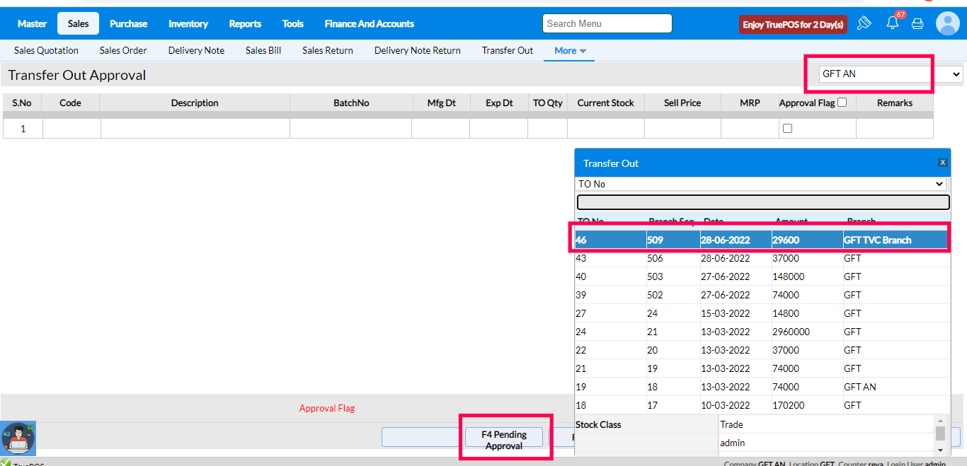 6. To approve the Transfer Out, Goto >> Sales >> Transfer out Approval. Select the