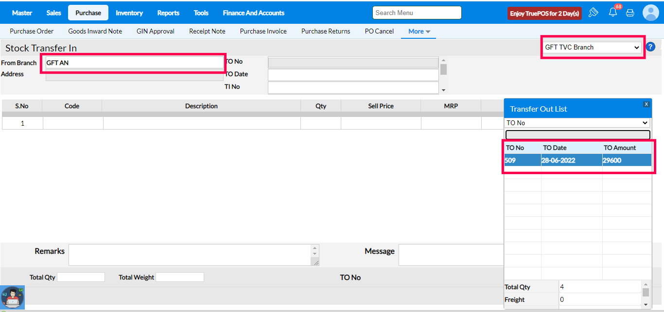 10. Select the TO No. and press Enter. The Transfer Out details will be displayed.