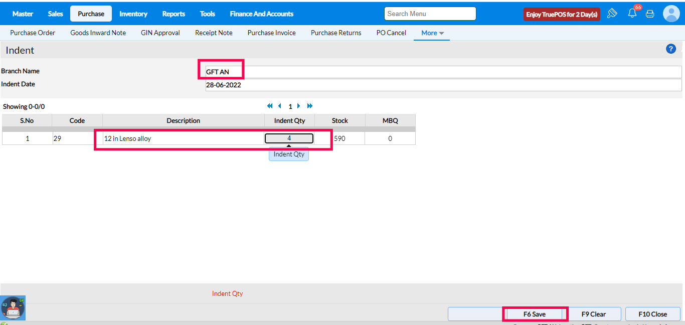4. Select the item from the item pop-up. Enter the Indent Qty and click on Save. Indent