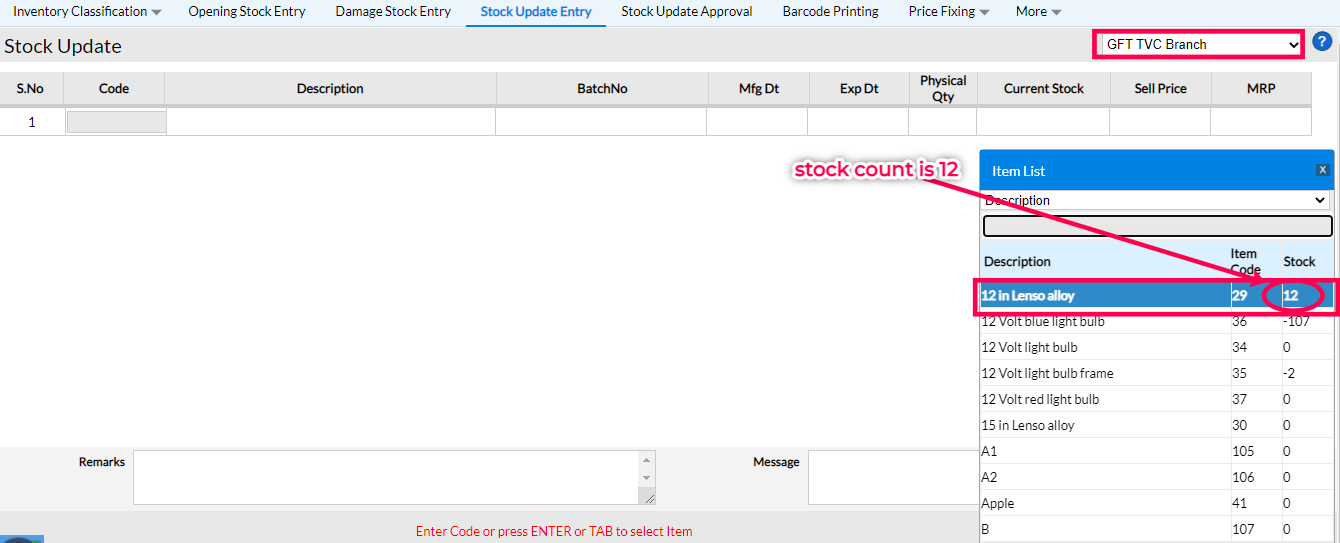 Goto >> Inventory >> Stock Update Entry and select the Branch to which you