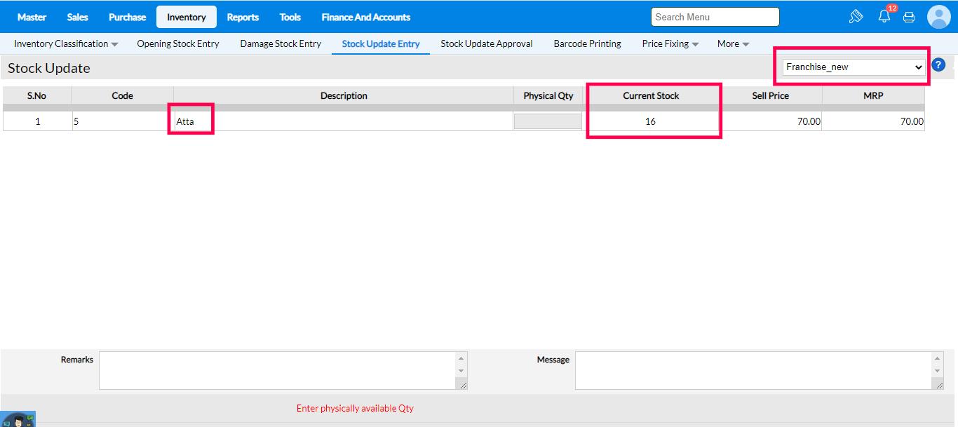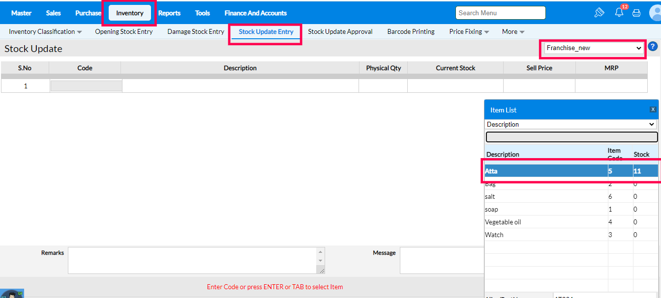 3. Select the item "Atta" and press Enter. The current stock level will be displayed. Make a note of it to verify the stock quantity after Transfer In