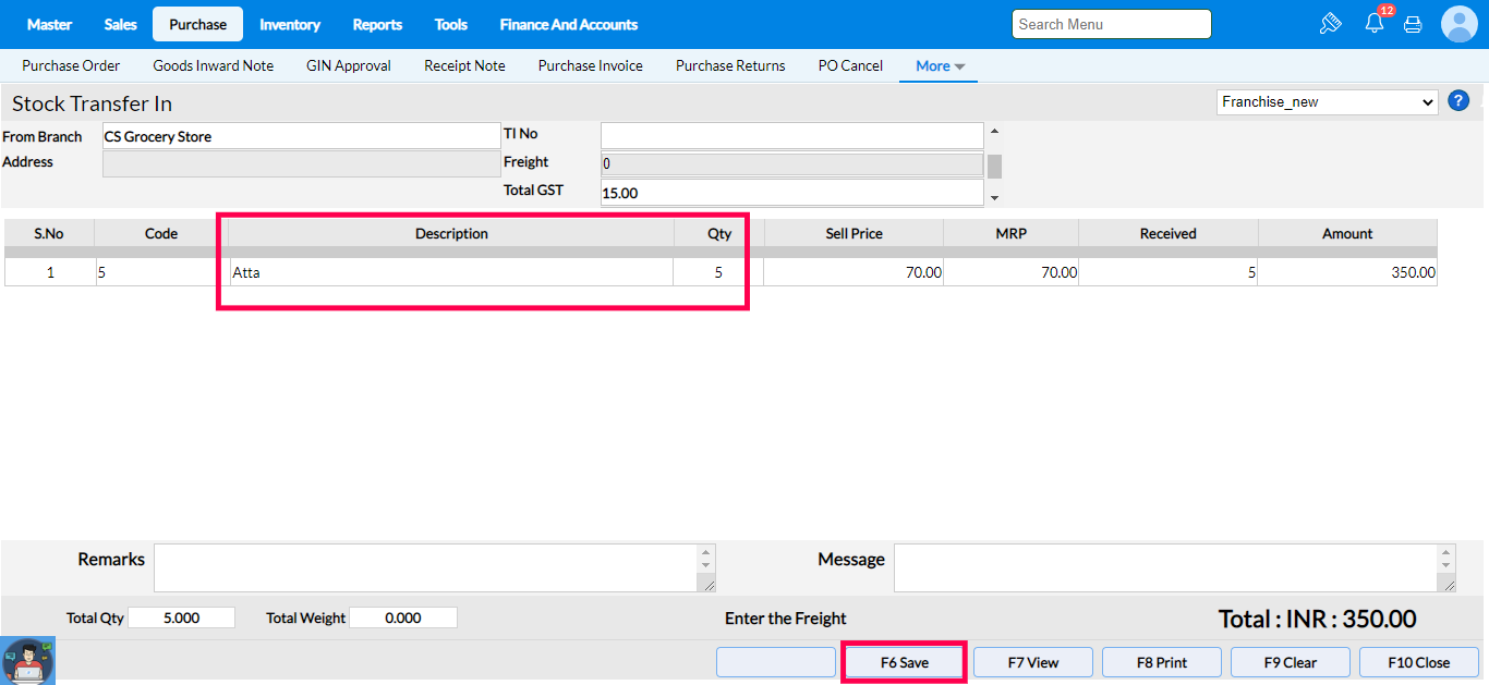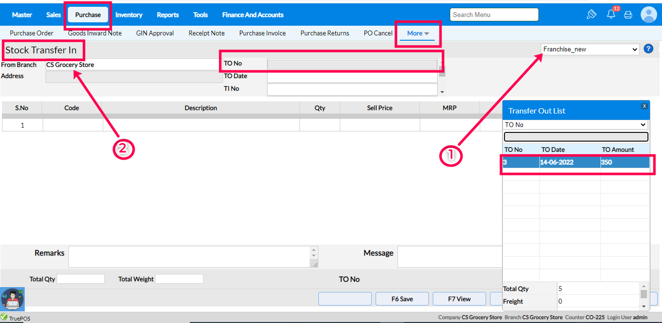 Let us consider a scenario where we need to transfer 5 nos of "Atta" from CS grocery store to branch Franchise_new using the Transfer In option of RetaiEasy OnCloud - Purchase menu.
