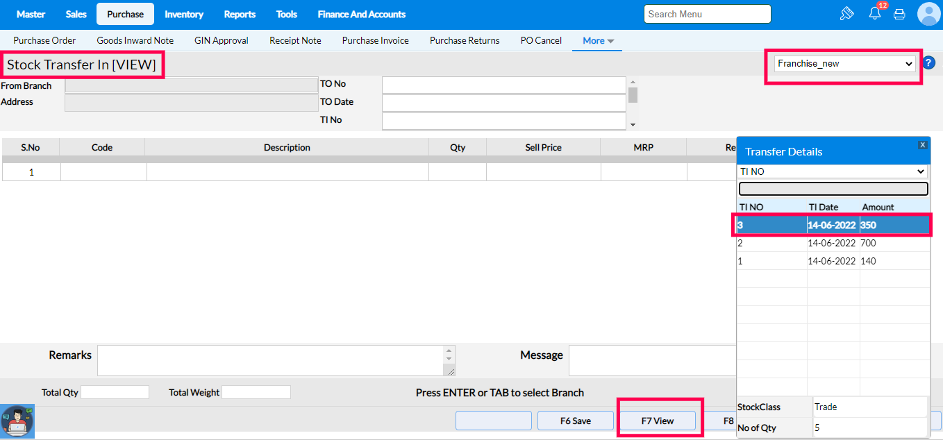 Click on F7 View to view the Transfer In list.