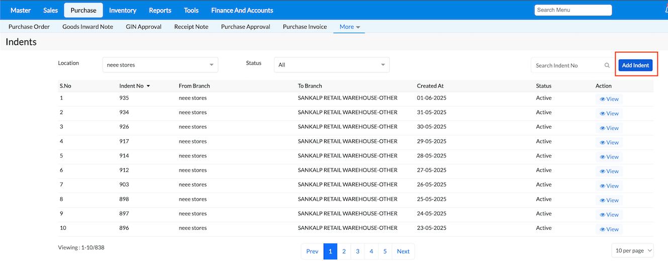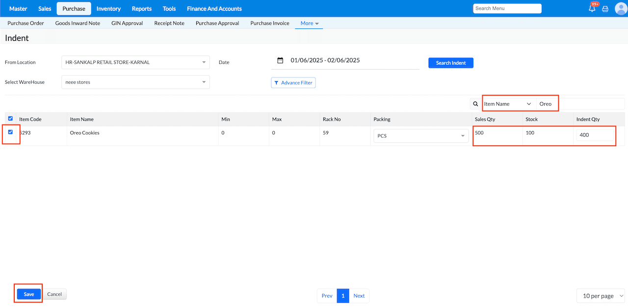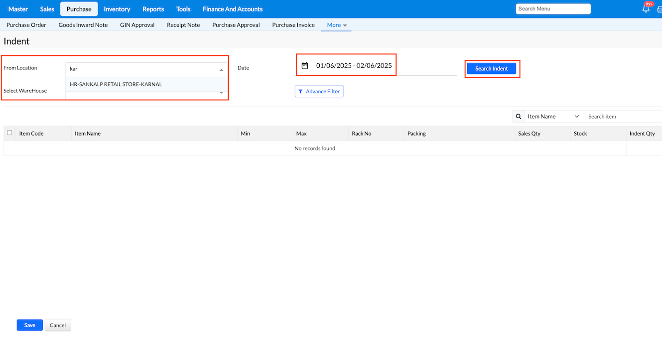 3.Select the 'From Branch' and the 'To Branch' (Warehouse). 4.Choose a Date to fetch corresponding Sales and Stock quantities. 5.Click Search Indent.