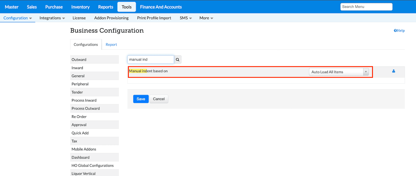 This document explains the configuration and usage of the Manual Indent feature when set to Auto Load All Items. This setup allows users to auto-load all items in the indent screen and generate indent quantities based on the selected date's sales and stock data. Business Configuration Steps to enable this feature: