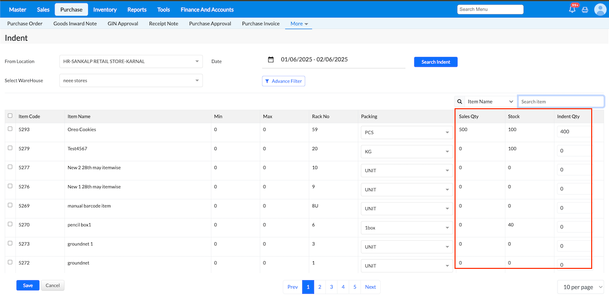 Once enabled, the system will automatically list all items in the Manual Indent screen. Purpose This configuration helps users efficiently generate indent quantities by comparing sales and current stock quantities based on a selected data. Steps to Use the Manual Indent Screen