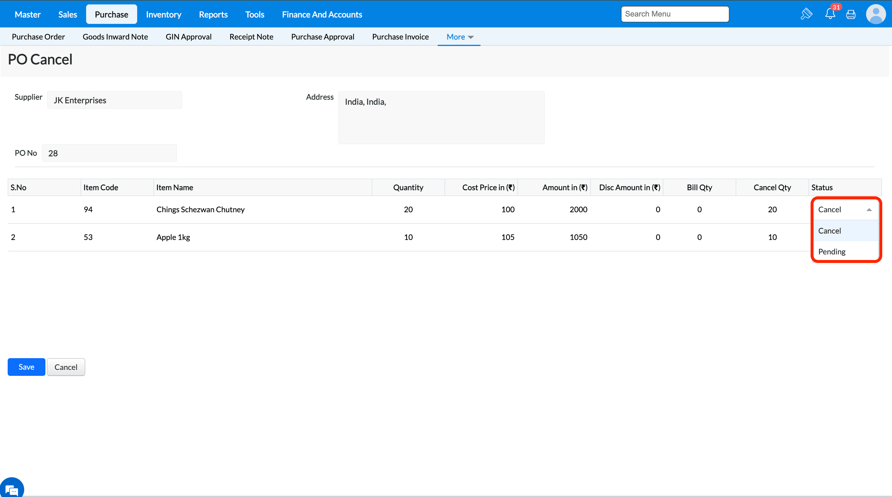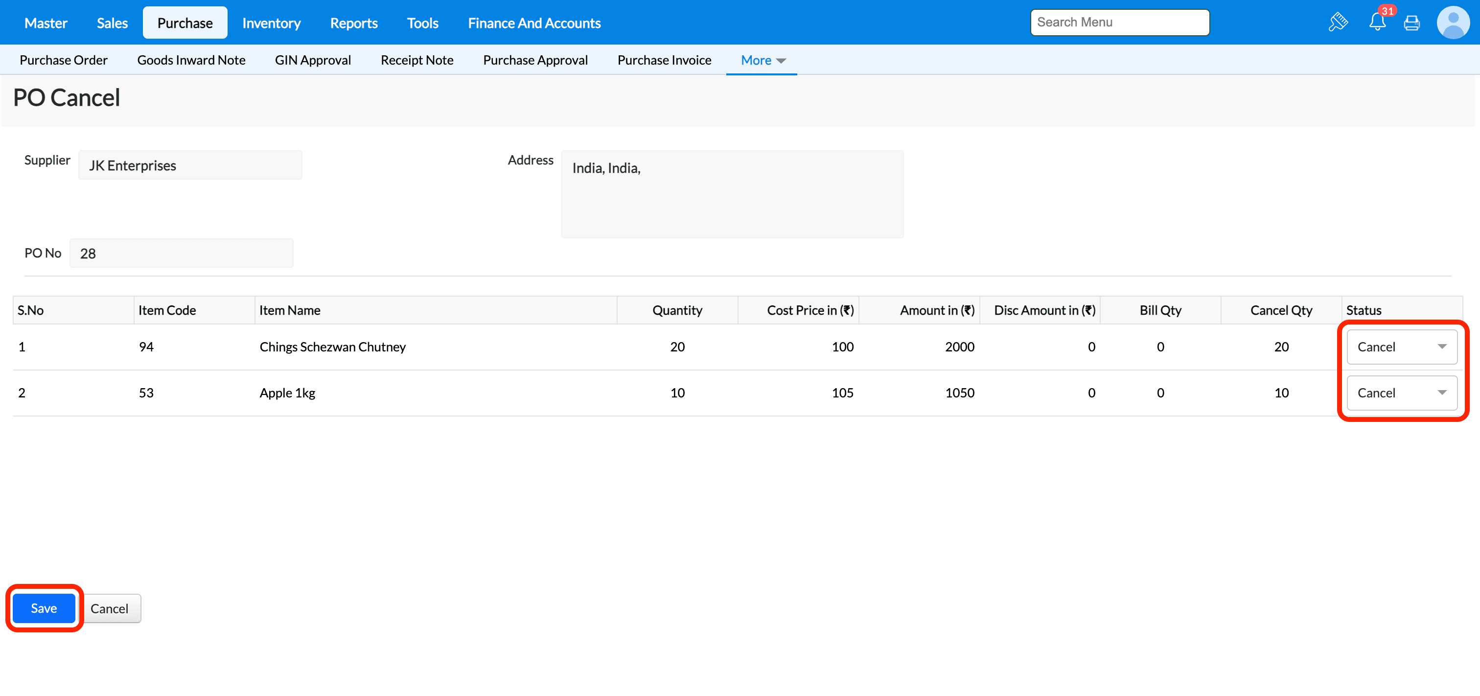 Select 'Cancel' for all the items in the PO to cancel the entire PO itself and click Save to store the changes.