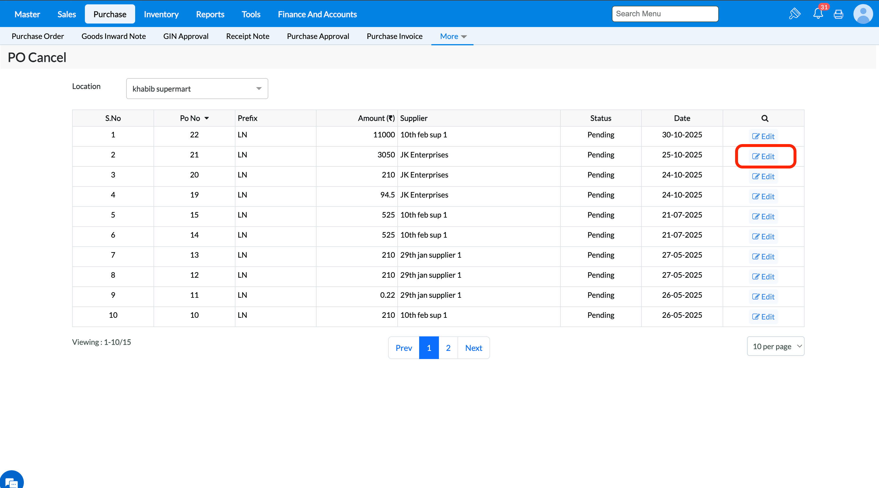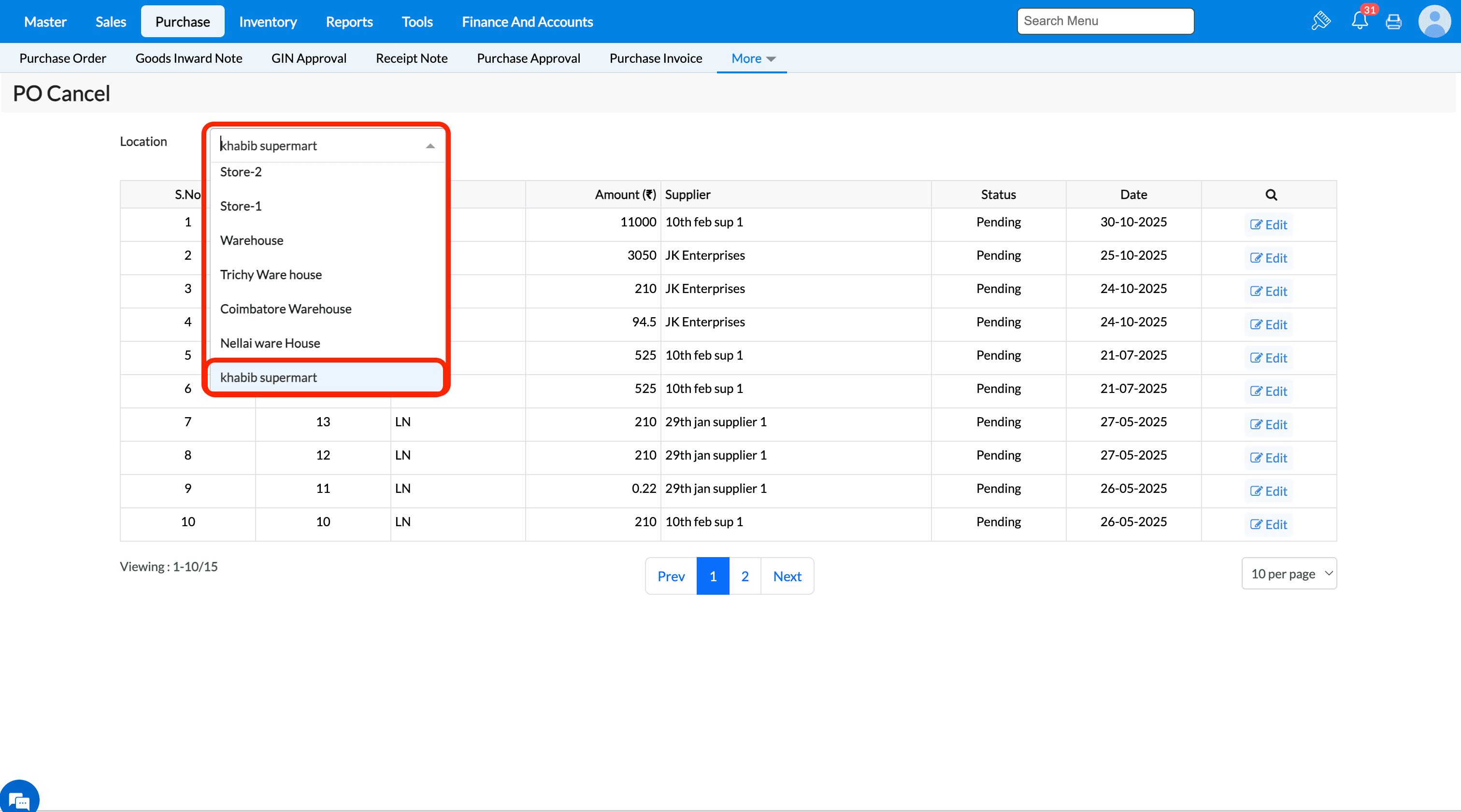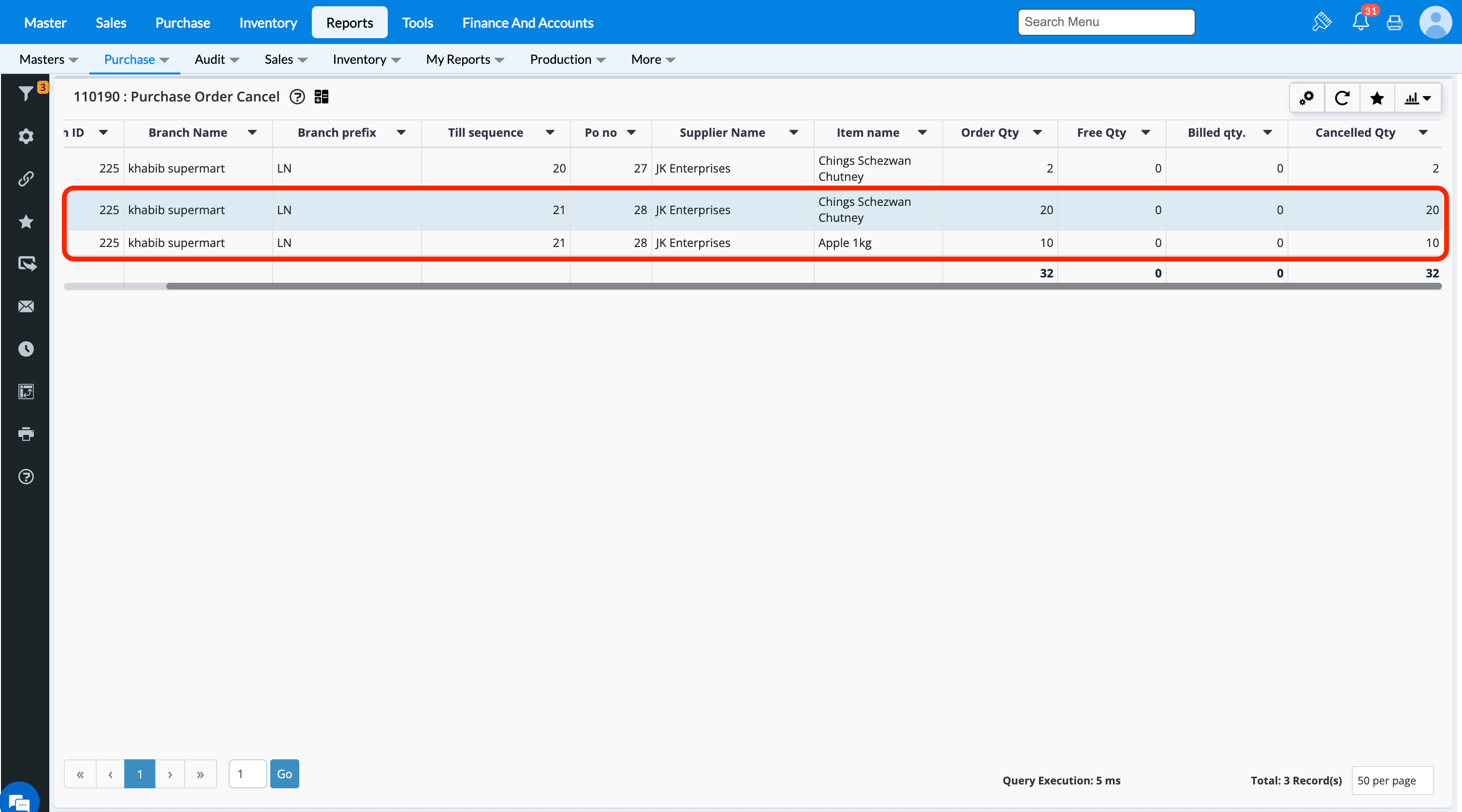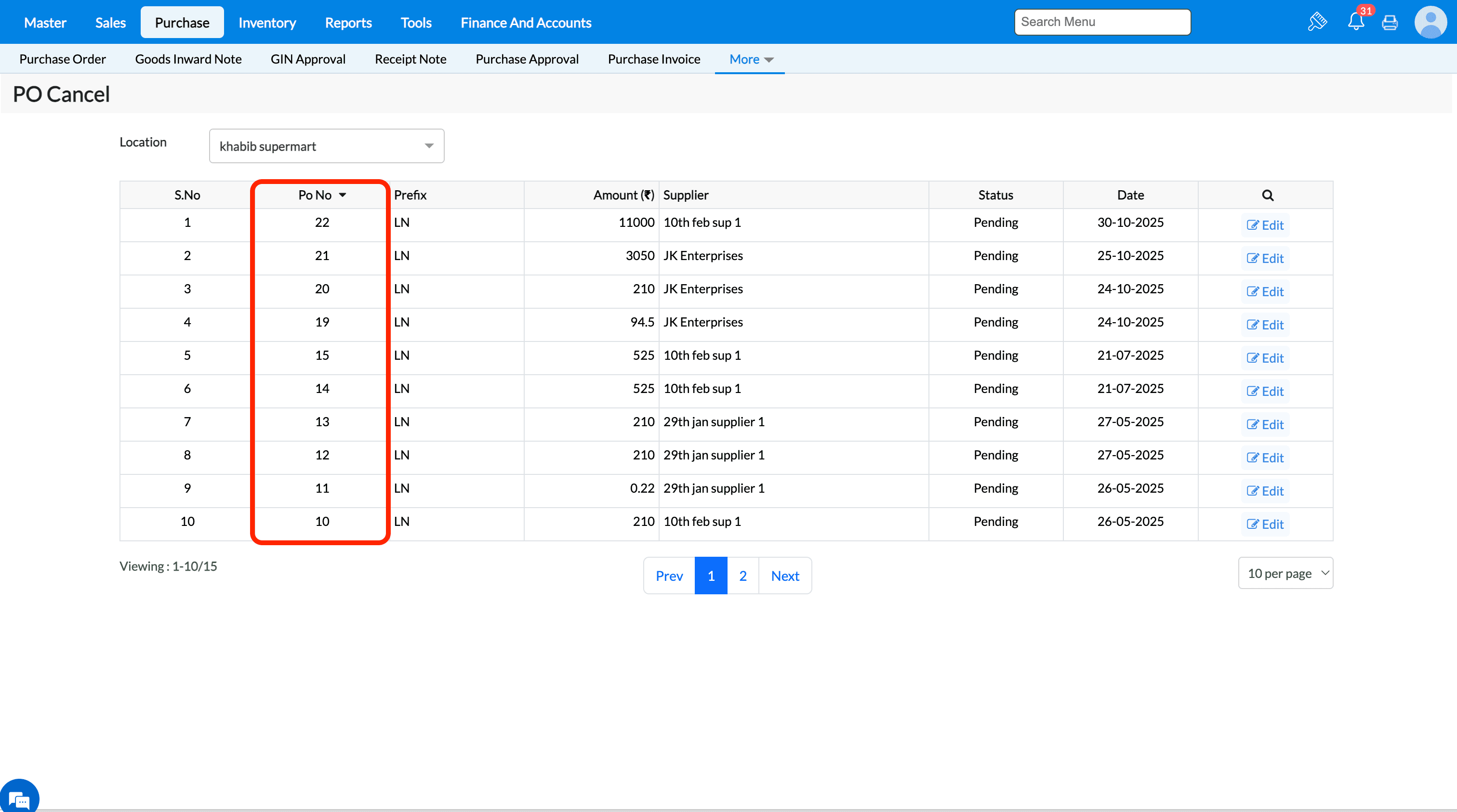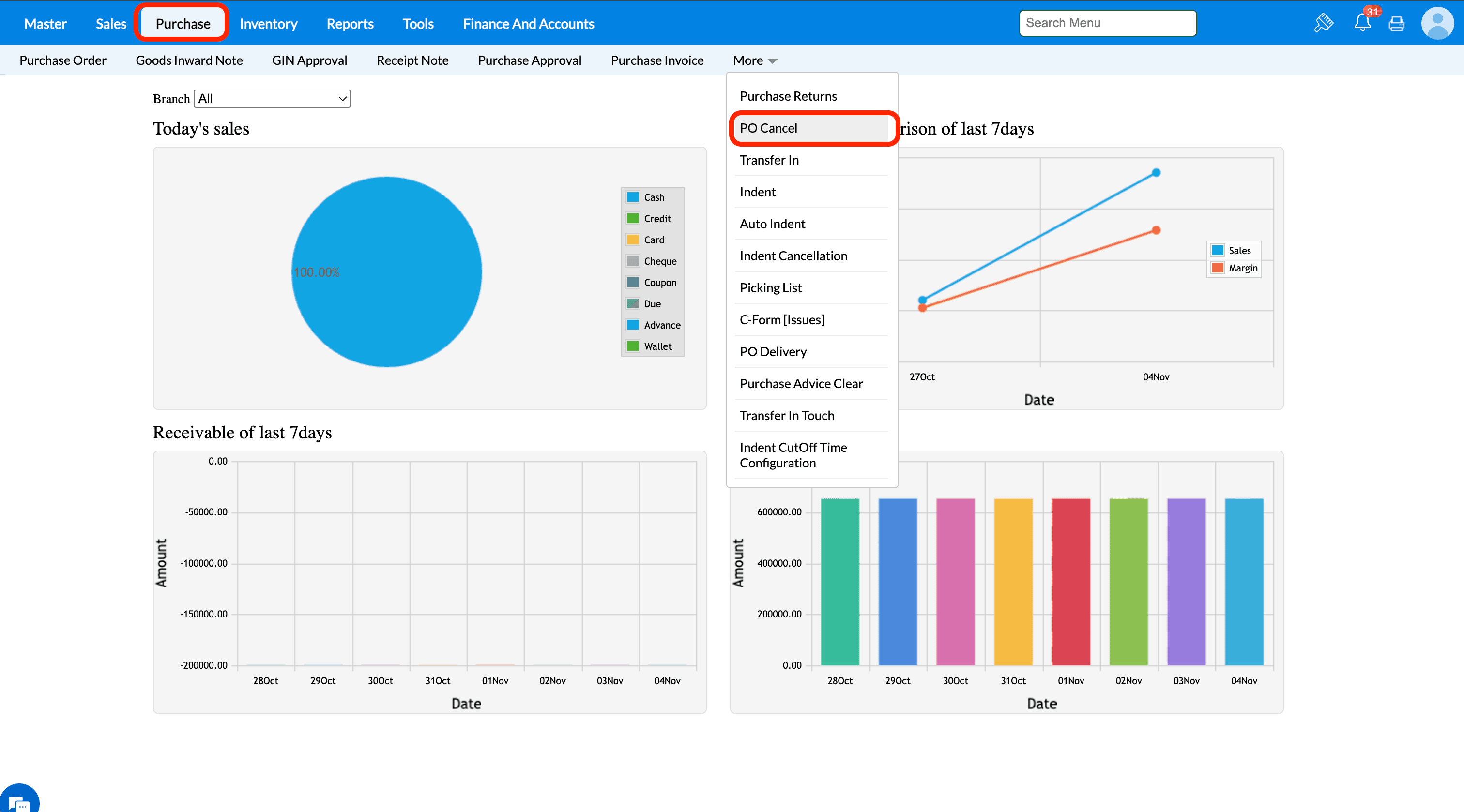 Click Reports > Purchase > Pending/Cancelled Transactions > Purchase Order Cancel to view the list of cancelled POs.