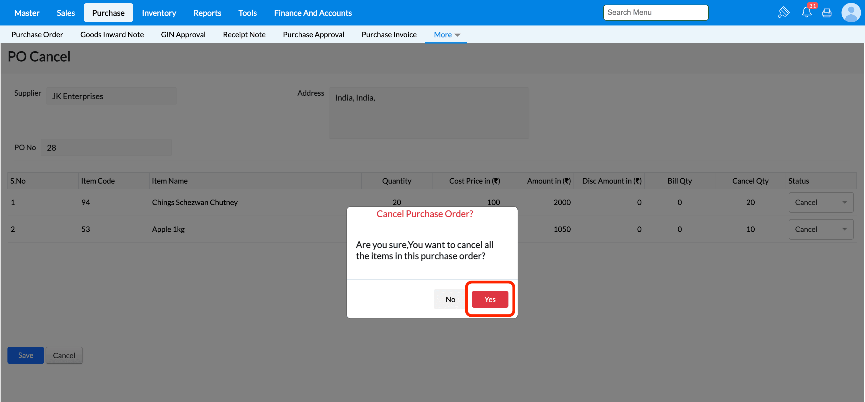 Purpose - The PO Cancel screen helps you cancel one or more items in a PO or the PO itself, when you are sure that you will not receive stocks against the PO.