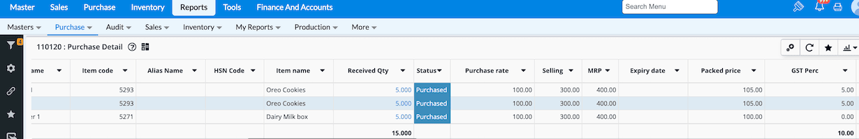 Q4. Where do I verify the Purchase Qty and status ? Navigate to Reports →Purchase → Transactions → Purchase Detail