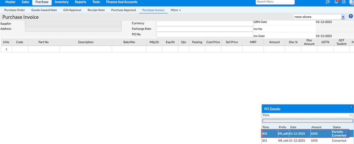 Q2.What if I edit quantities or remove items during conversion? When the configuration is enabled,Even if quantities are changed or some items are removed while converting to RN/PI, the PO will still be written off and excluded from the Pending list. Q3. Can I reload the PO again in the Purchase Invoice screen if the configuration is disabled? Yes.If the configuration is disabled at the time of Purchase order, and you convert it partially, the remaining quantities of the PO will still be available in the Purchase Invoice screen. In the LOV, the PO will appear with the status “Partially Converted.”
