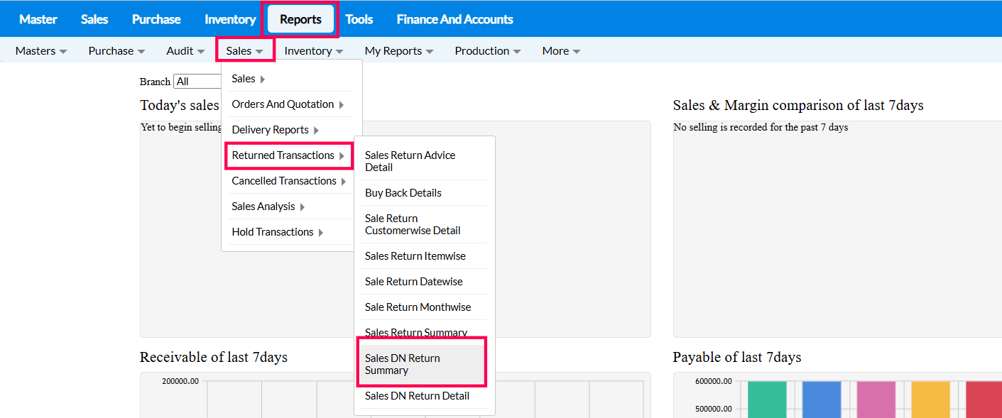 Menu Path: Reports → Sales → Returned Transactions → Sales DN Return Summary