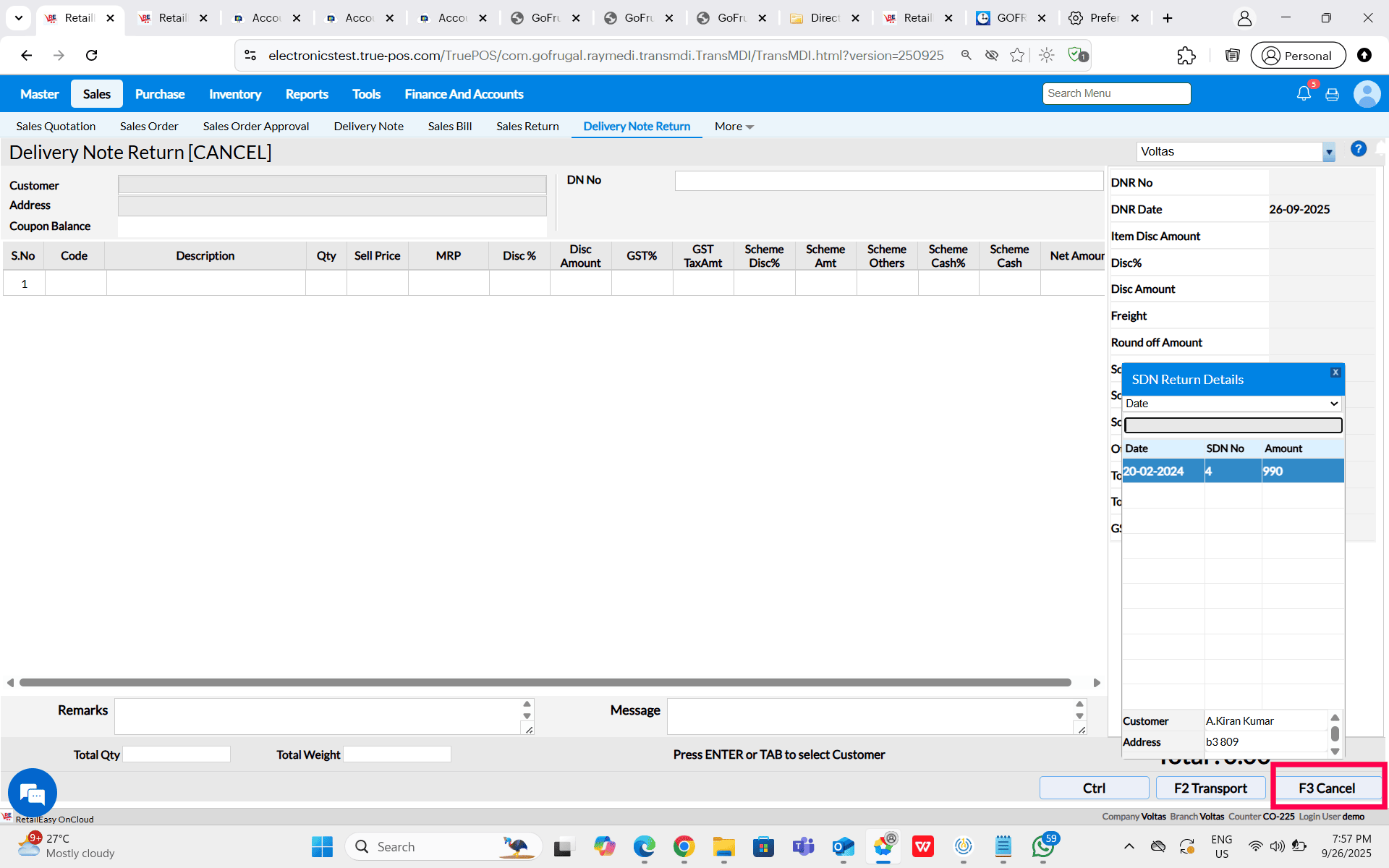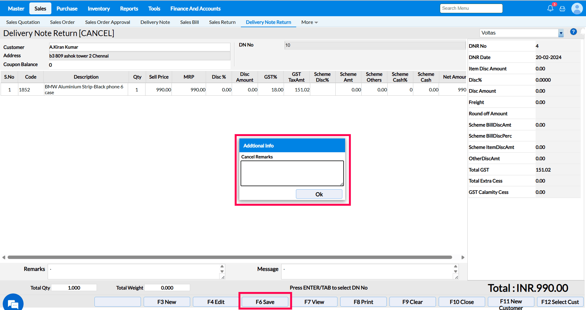 6. Press F6 or click Save to confirm cancellation. After saving you will get the popup delivery note return canceled.