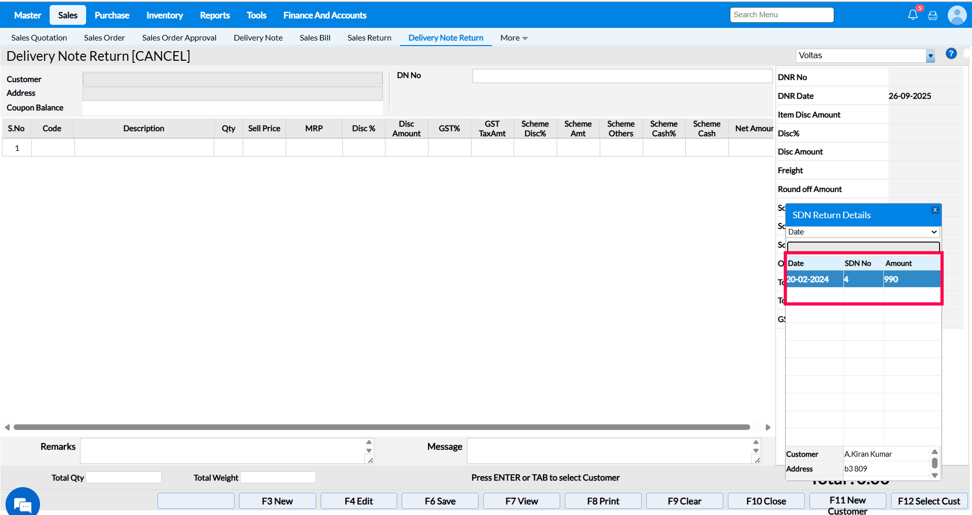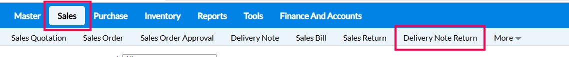 1. Open the delivery note return screen Menu Access: Click Sales > Delivery Note Return