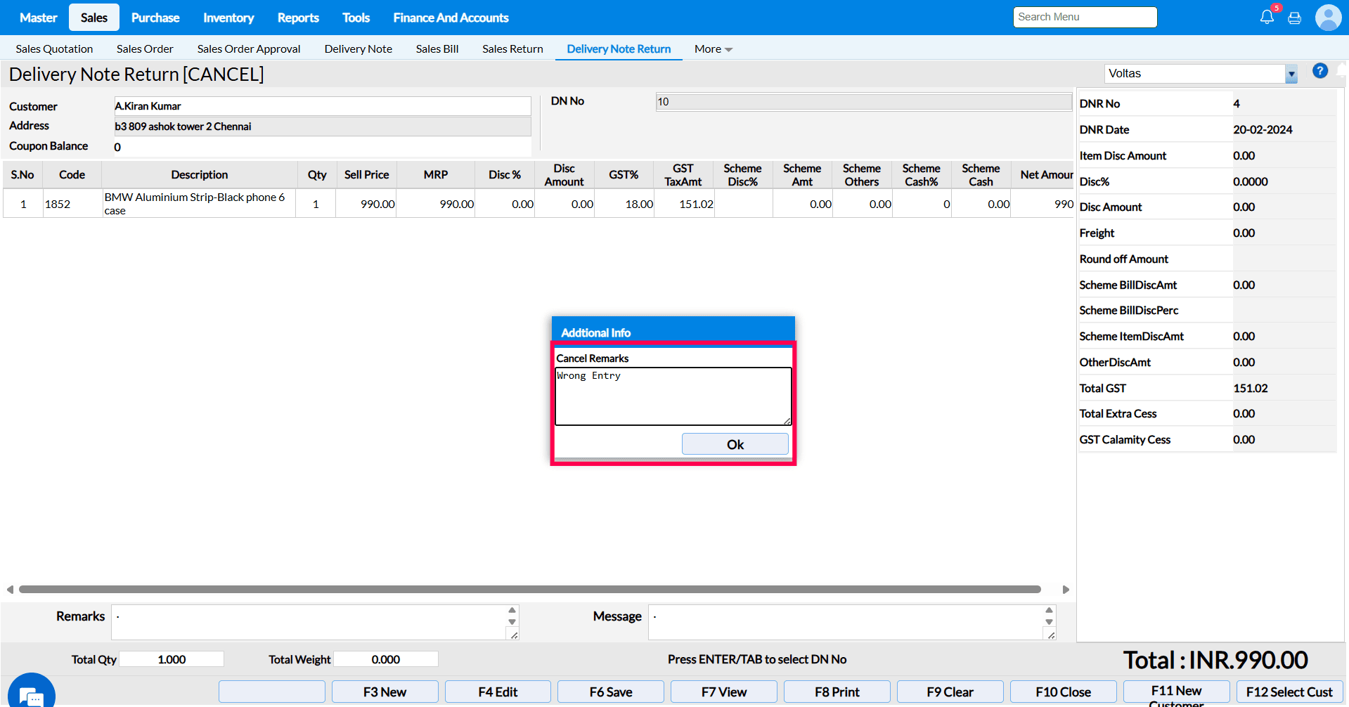 Delivery Note Cancel : Steps to Cancel a Delivery Note, 1. From the Dashboard, Go to → Sales → Delivery Note 2. Click on CANCEL or Press 'Ctrl+F3' Delivery Note pop-up displays only Delivery Notes that are not billed yet. 3. Select a Delivery Note to ...