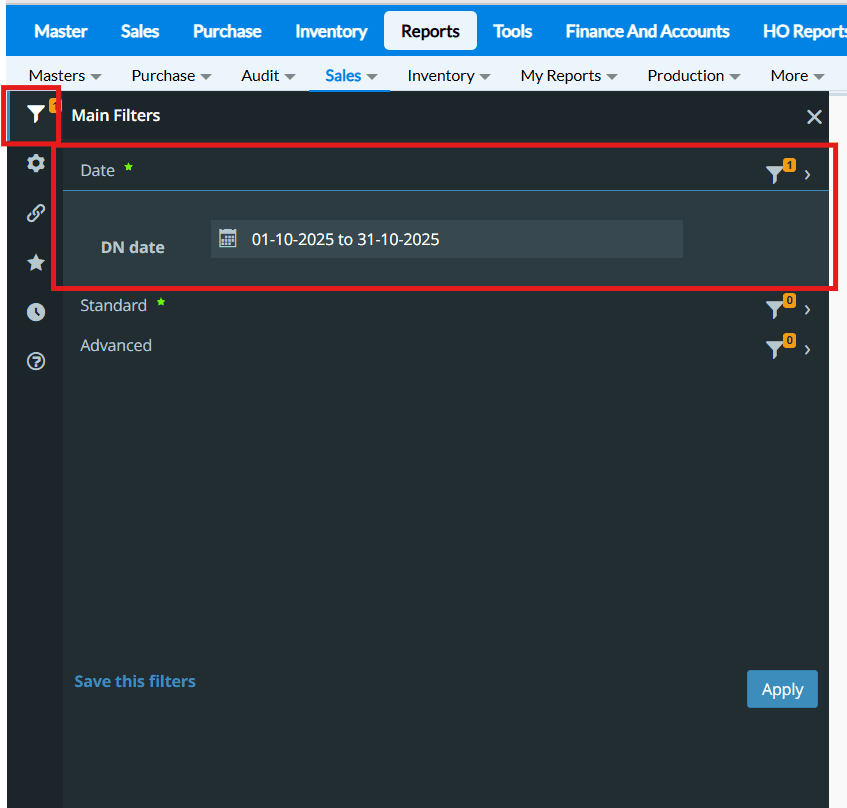 From the Dashboard, Click Reports → Sales → Delivery reports → Sales delivery note detail