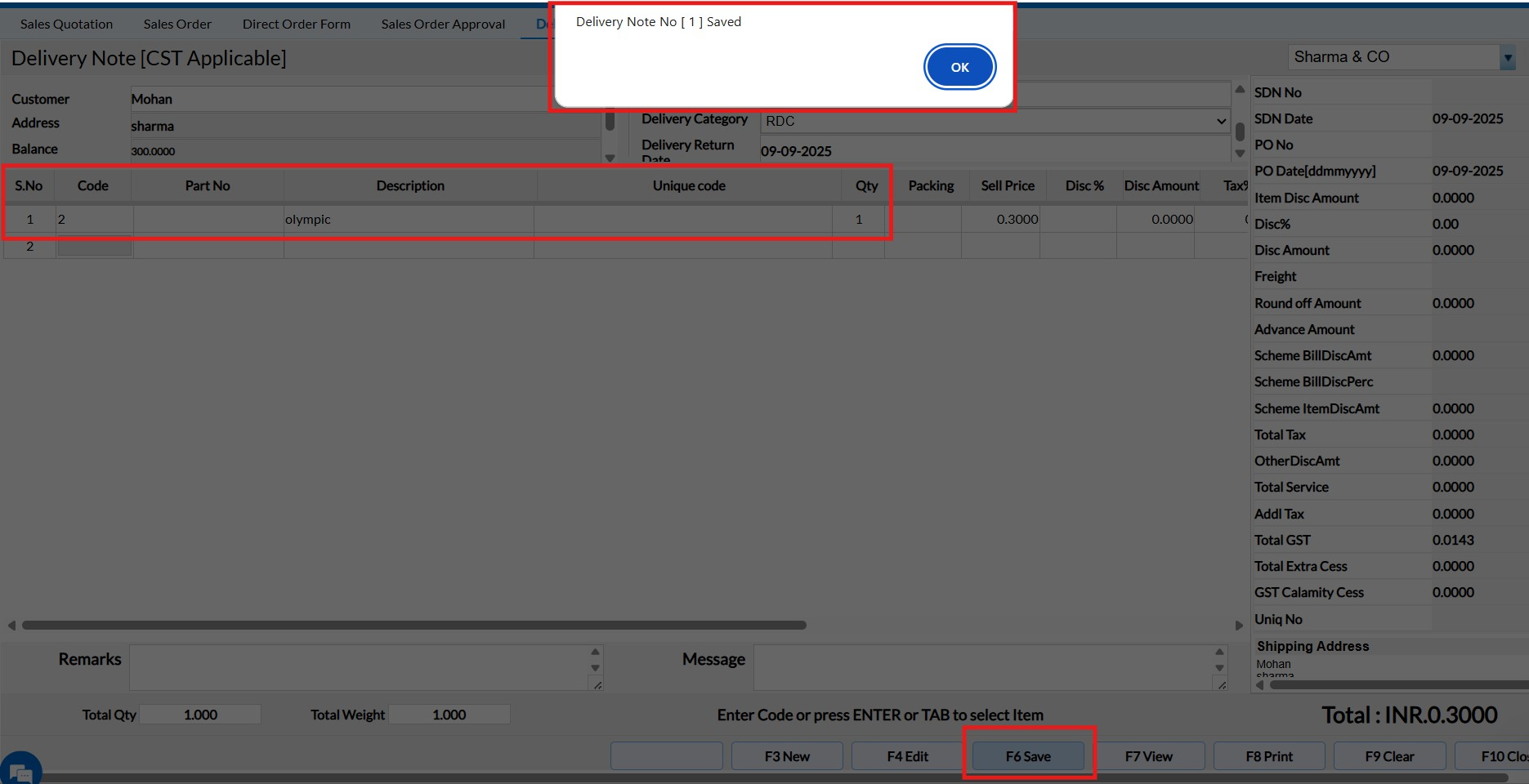 7. After selecting the details item details kindly 'Save' the Delivery Note → Shortcut F6 and you will get the successful pop-up.