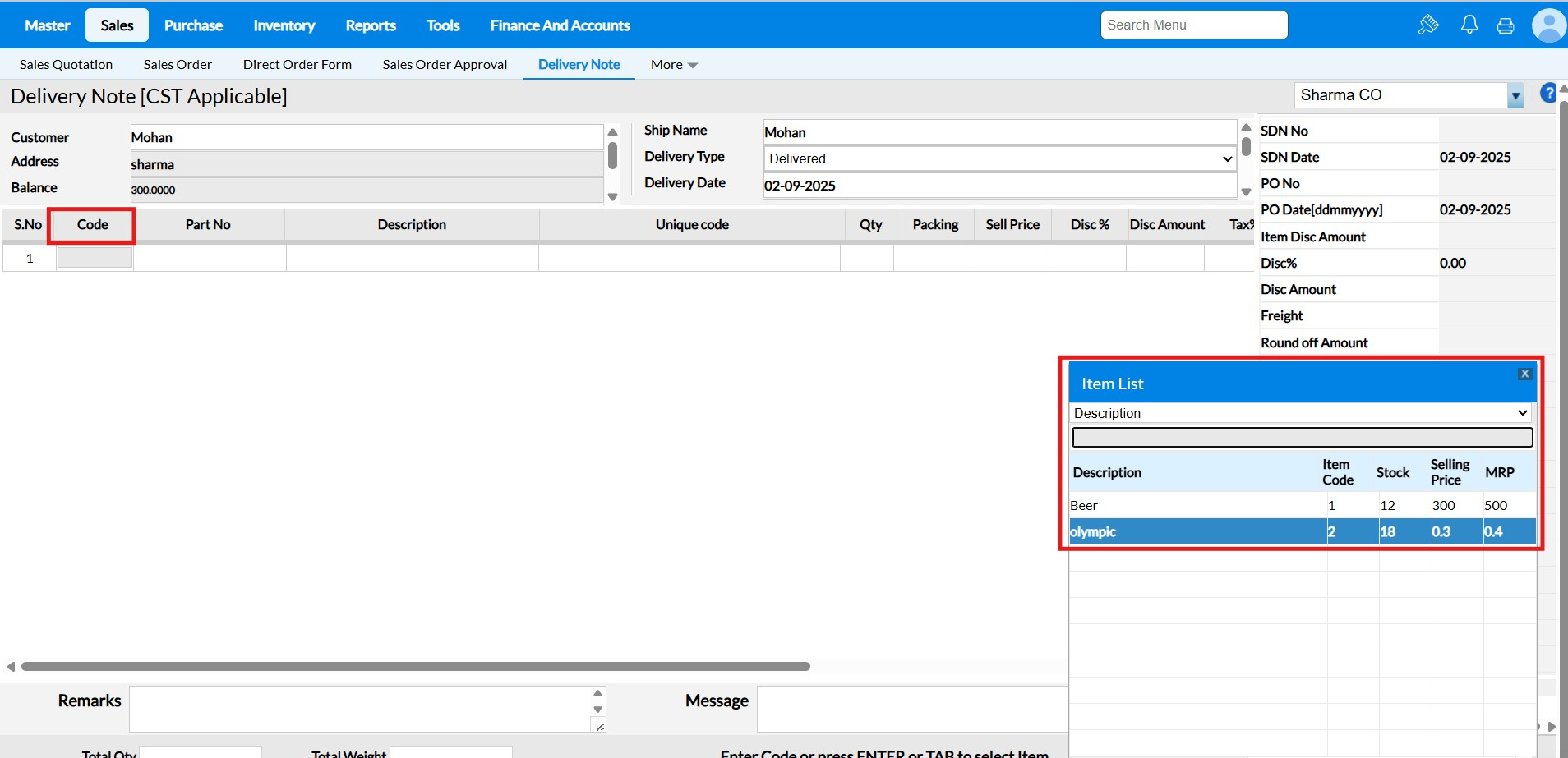 5. Select the item by pressing the Enter key in the item code and select the respective item from the Item list.