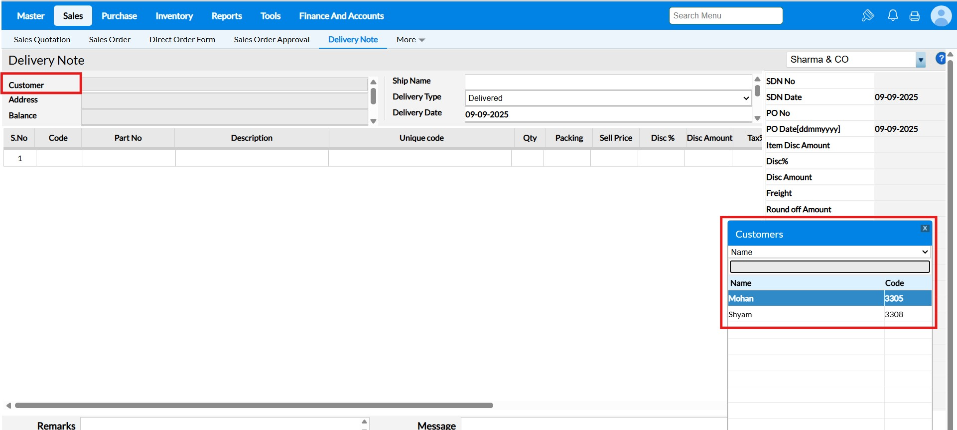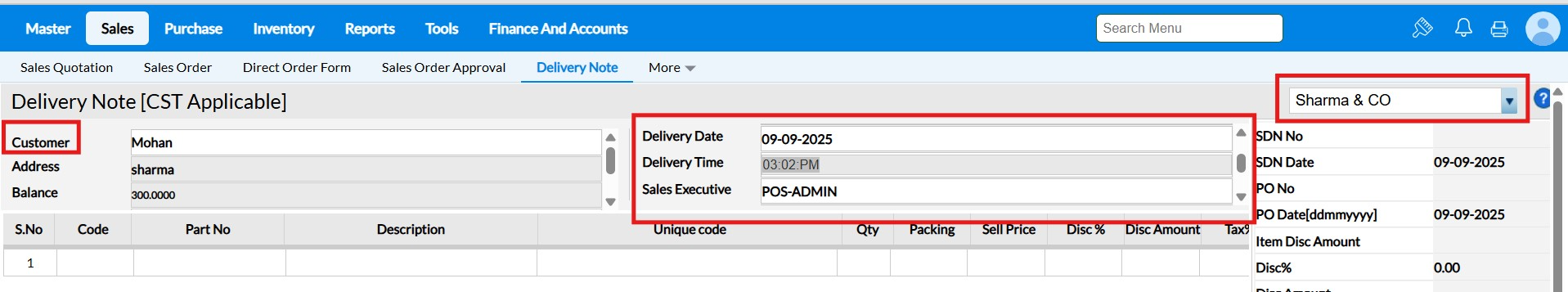 Using the Delivery Note screen, you can prepare delivery notes for items shipped to customers against a Sales Order.
