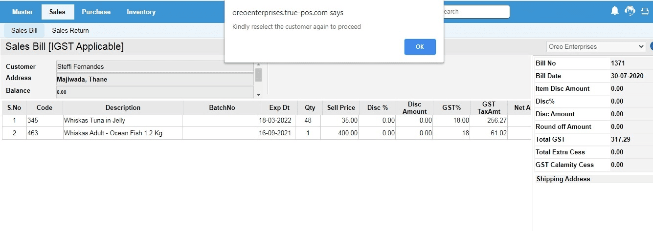 19) Getting below Error as "Kindly Reselect the Customer to Proceed" while saving the bill?