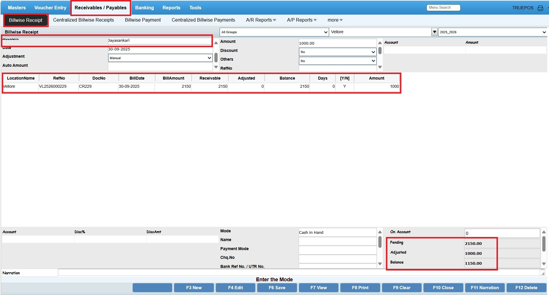 2 - If the customer is adjusting the Payments, you will have to adjust the bill in the Finance and Accounts --> Receivables and Payables --> Bill wise Receipt