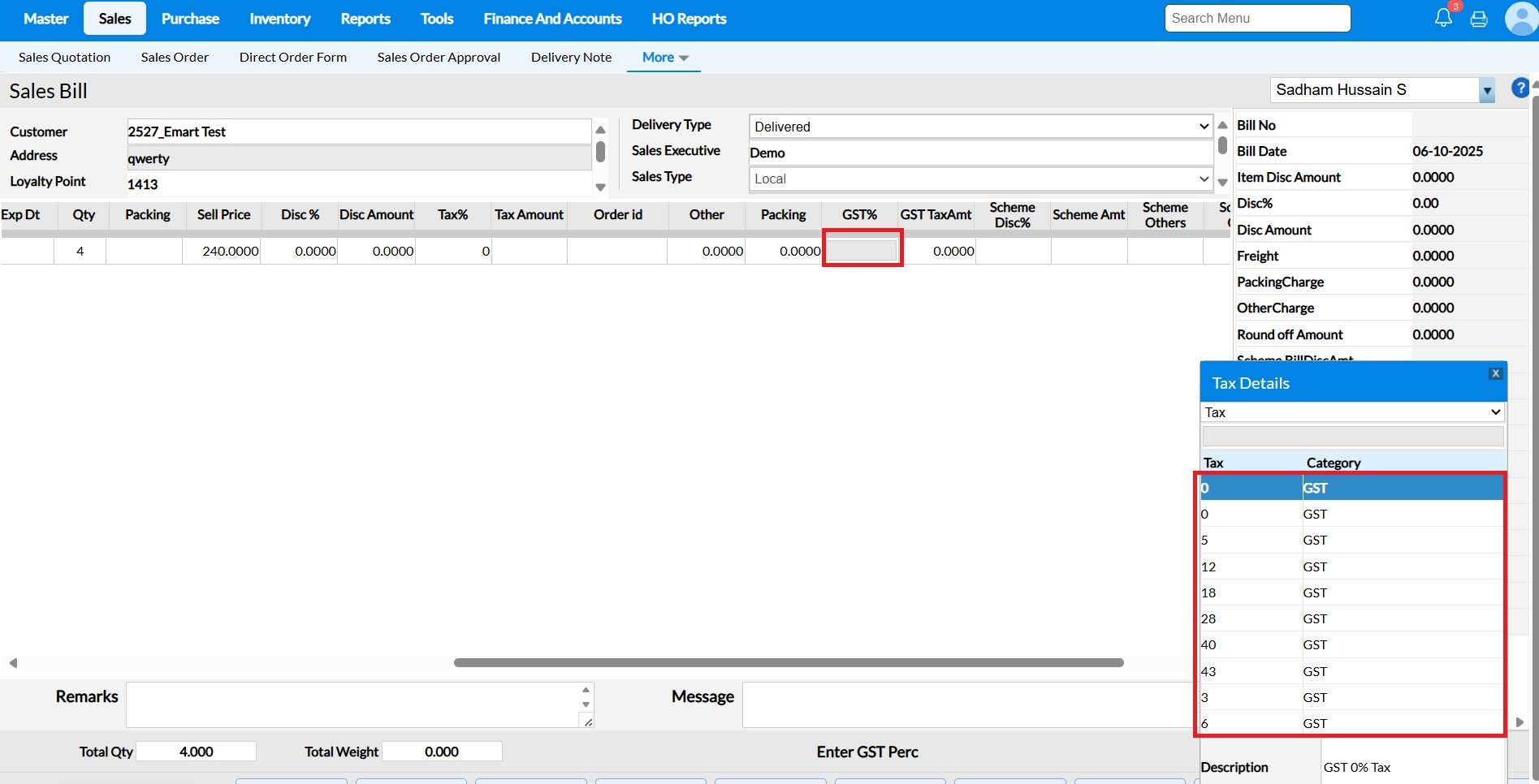 The Item Name, Sell Price, and Tax% will auto-populate.