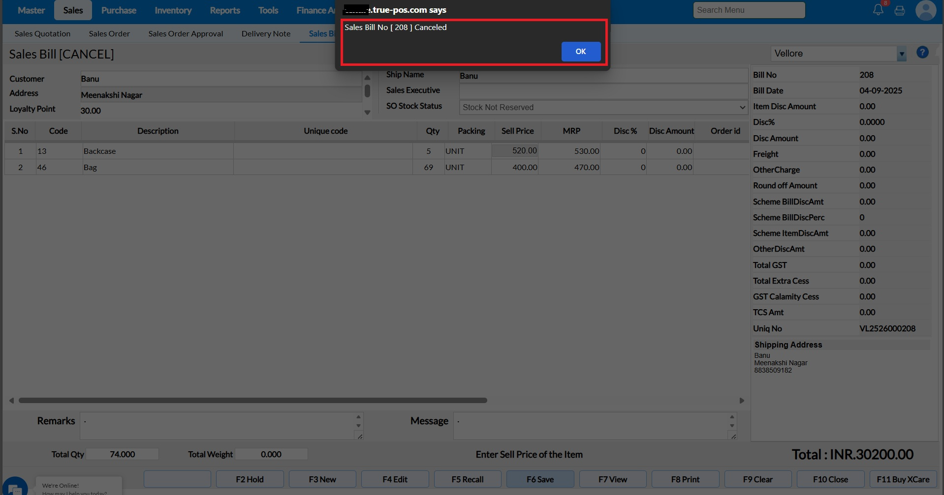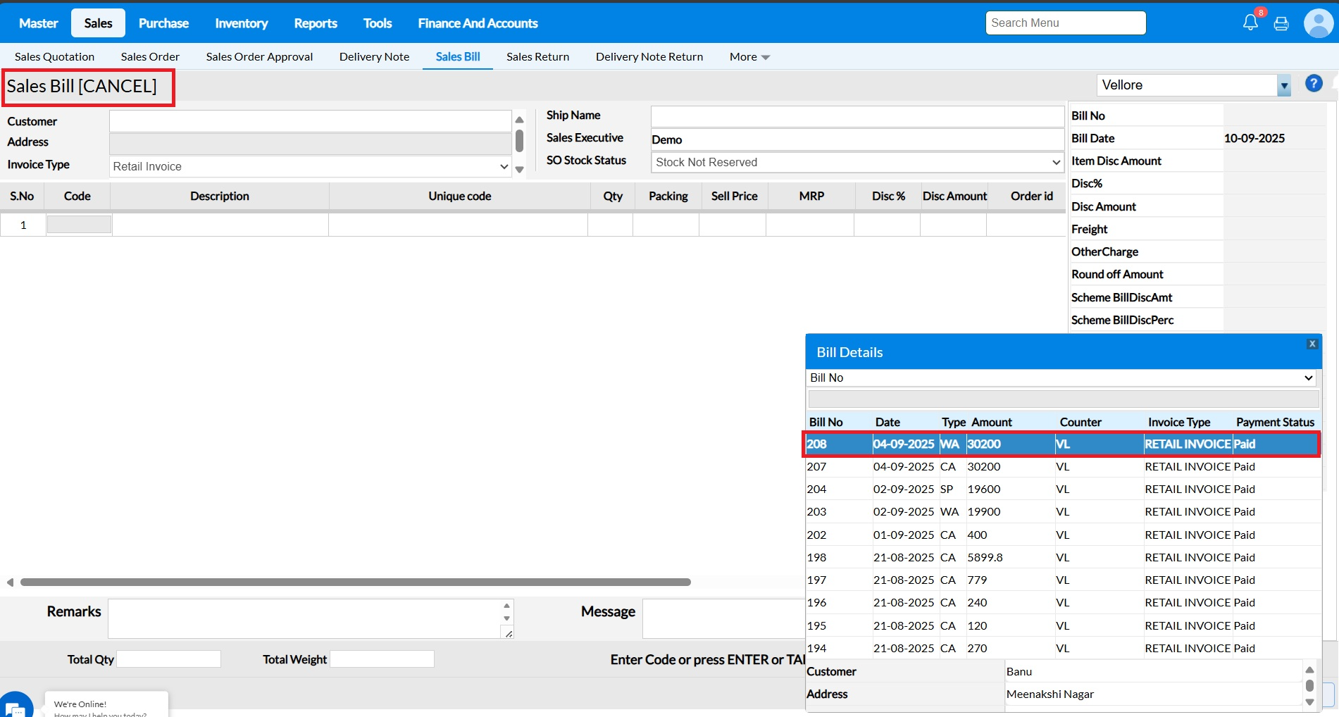 Sales Bill Details pop-up displays all the Bills except those cancelled already.