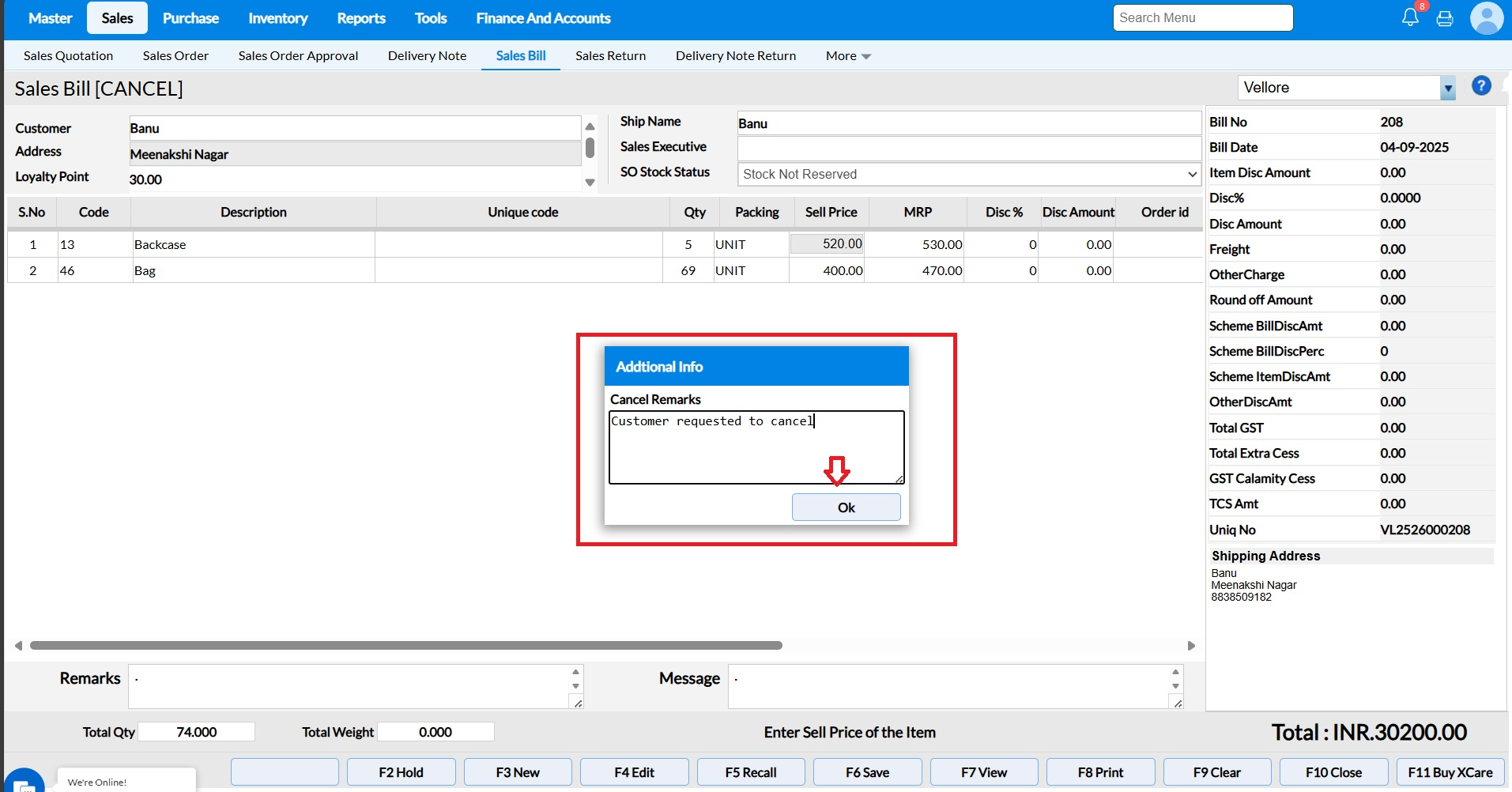 Sale Bill is marked as 'CANCELLED' and Sales Order is also marked as 'PARTIAL DELIVERED'. |