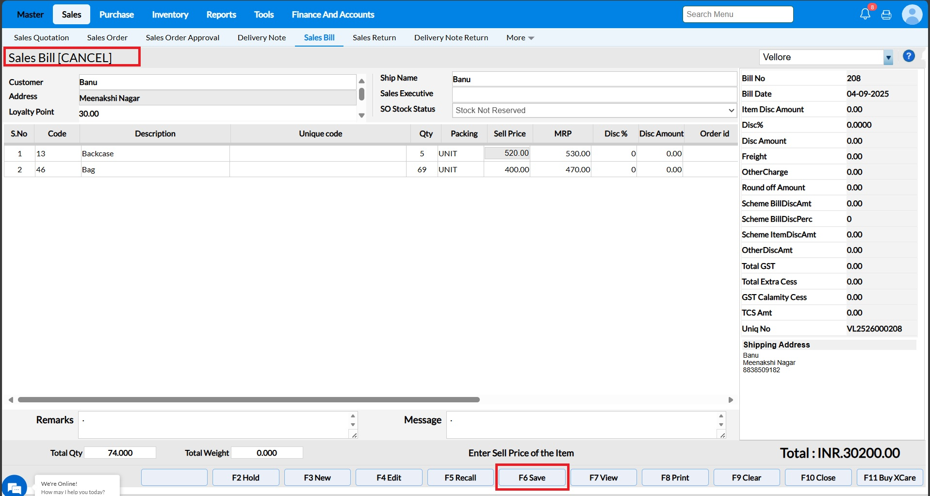 The Sales Bill screen displays the details of the selected note in [CANCEL] mode.