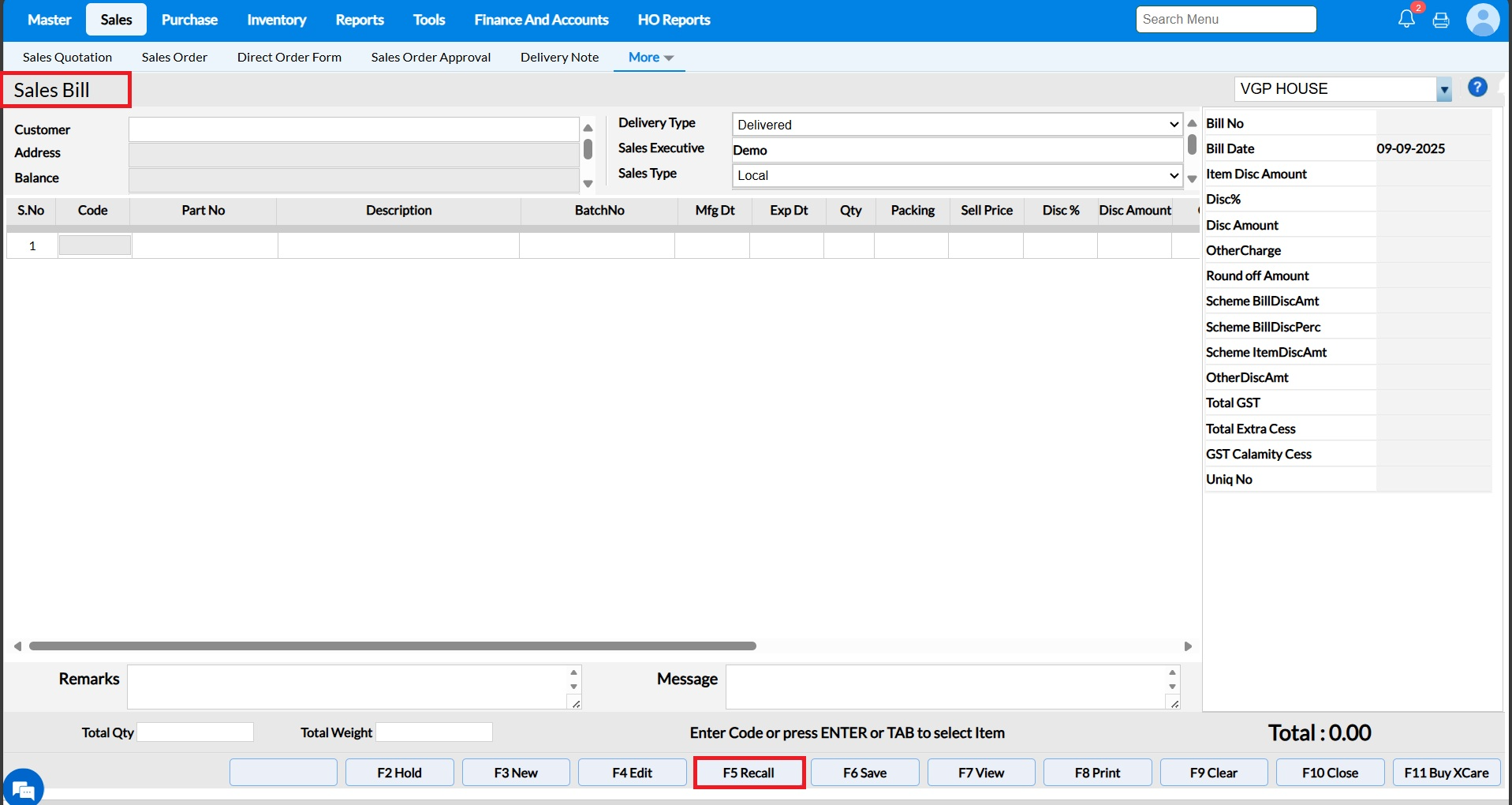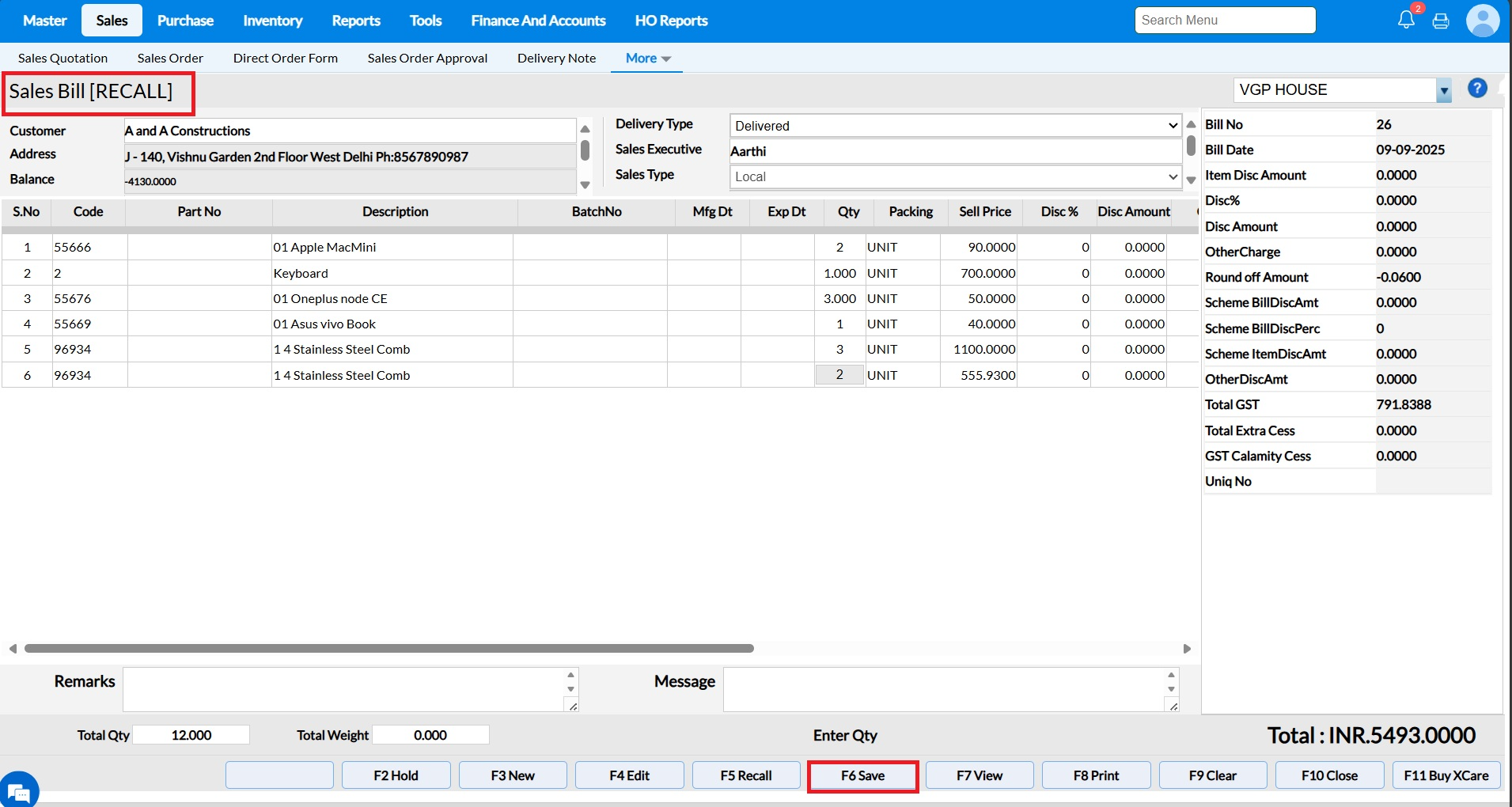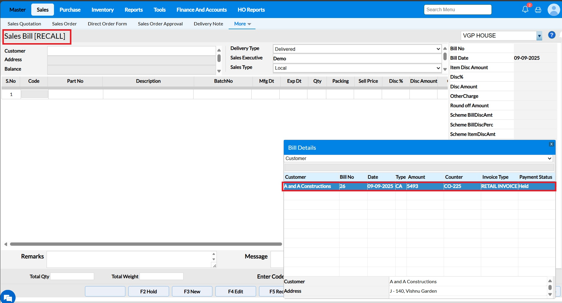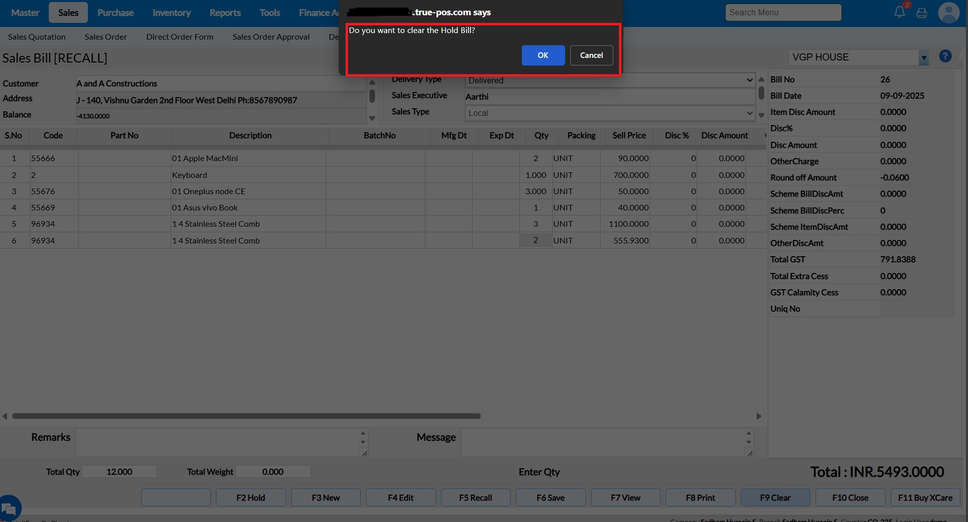 Once the bill is recalled you can either save the bill or clear the bill or Hold the bill again. After recall click on to save the bill