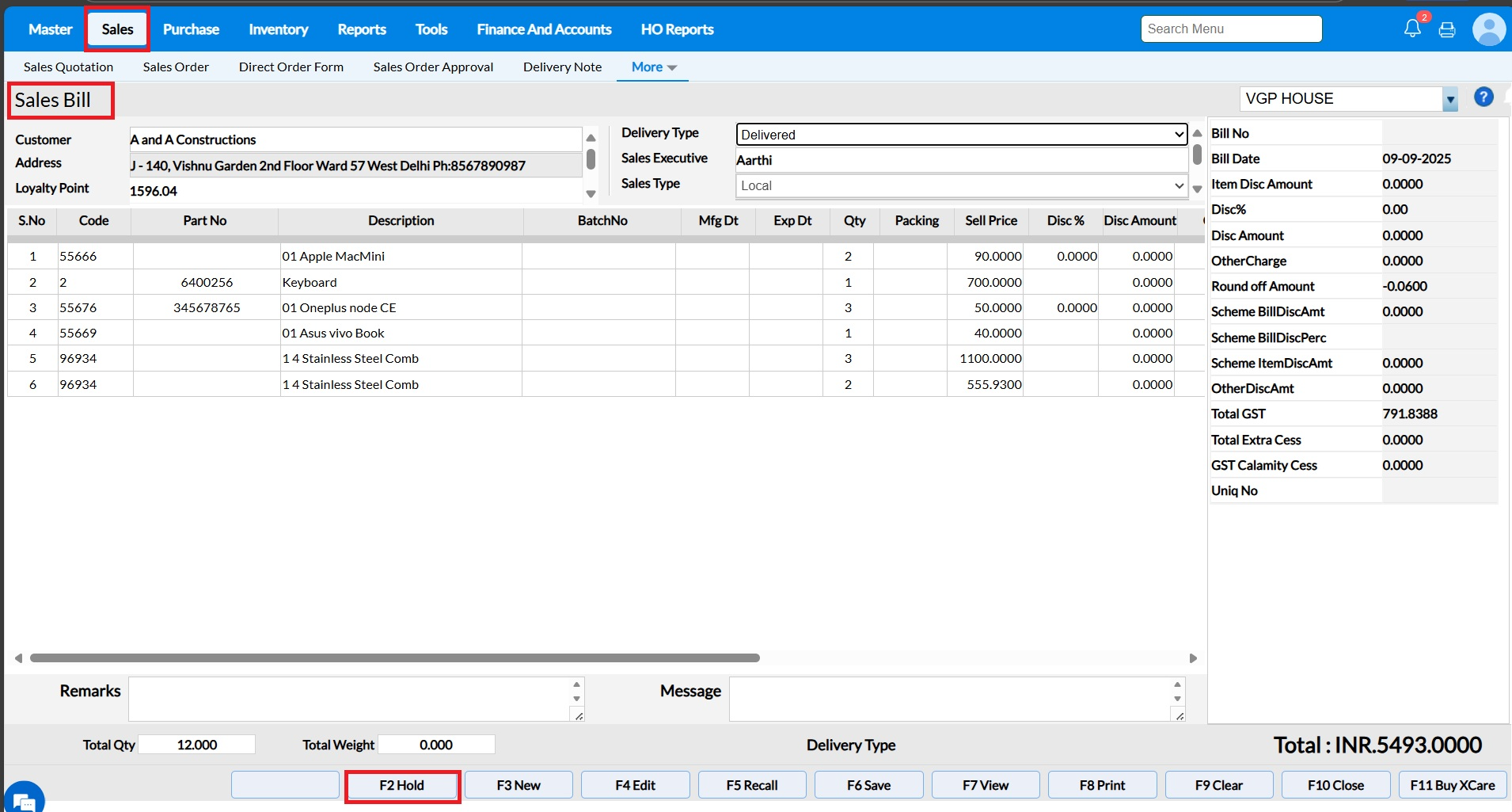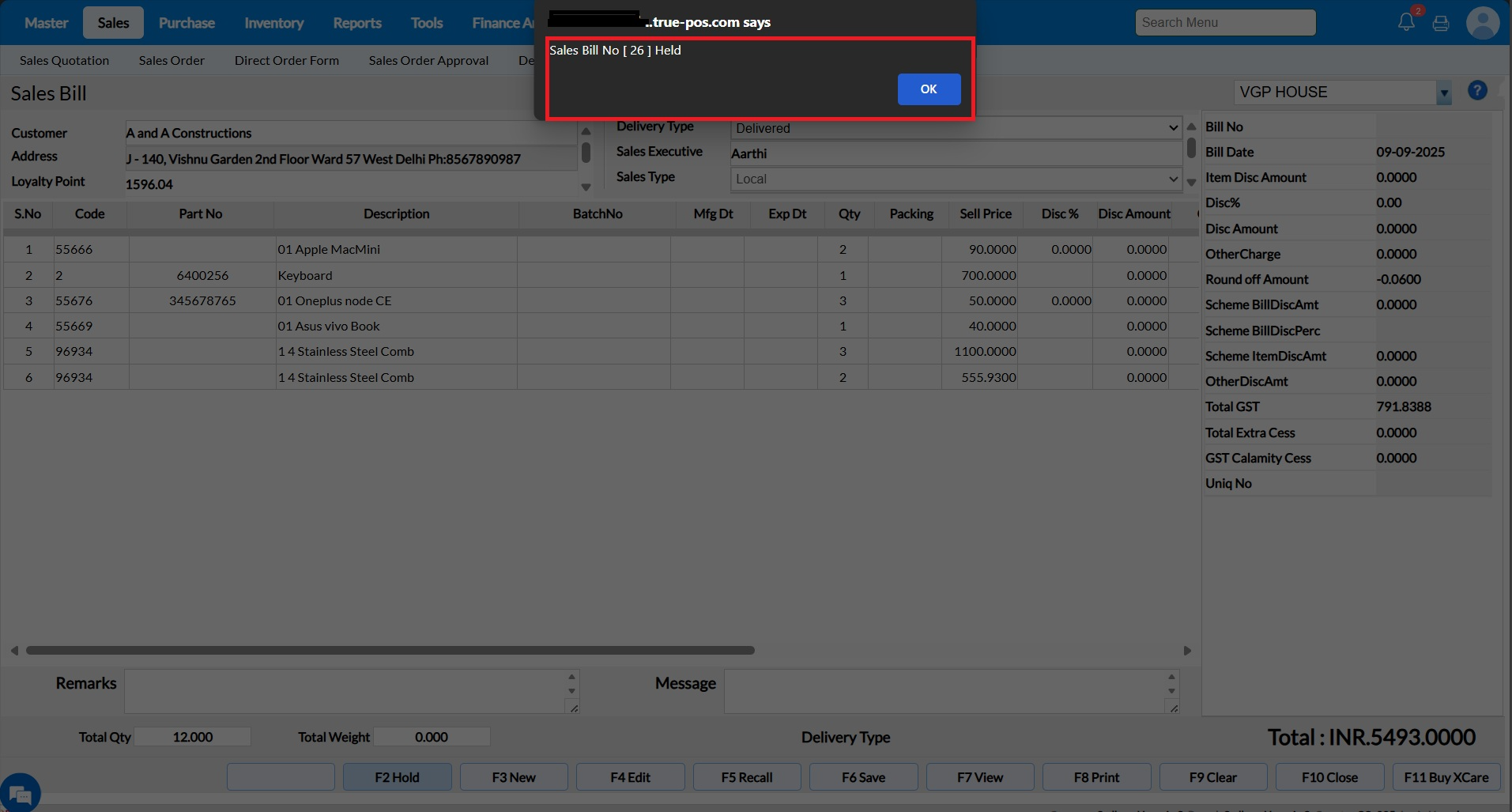 Purpose: A customer for whom you are billing in the counter, suddenly remembers that they forgot to add another item to the cart. So they will excuse themselves and leave the counts. Already added 20+ items in sales screen, it is not feasible to clear the screen and add all those items as soon as the customer arrives. It is also not possible to wait for the customers when a queue is there in counter. In this case, you can hold the bill of that customer and continue making other bills. When that customer arrives after adding few more items, you can recall the previously held bill and continue billing smoothly.