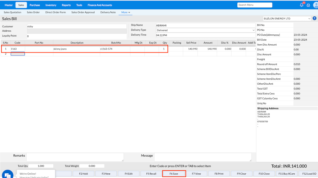 In Sales Bill screen, create sales bill for the item.