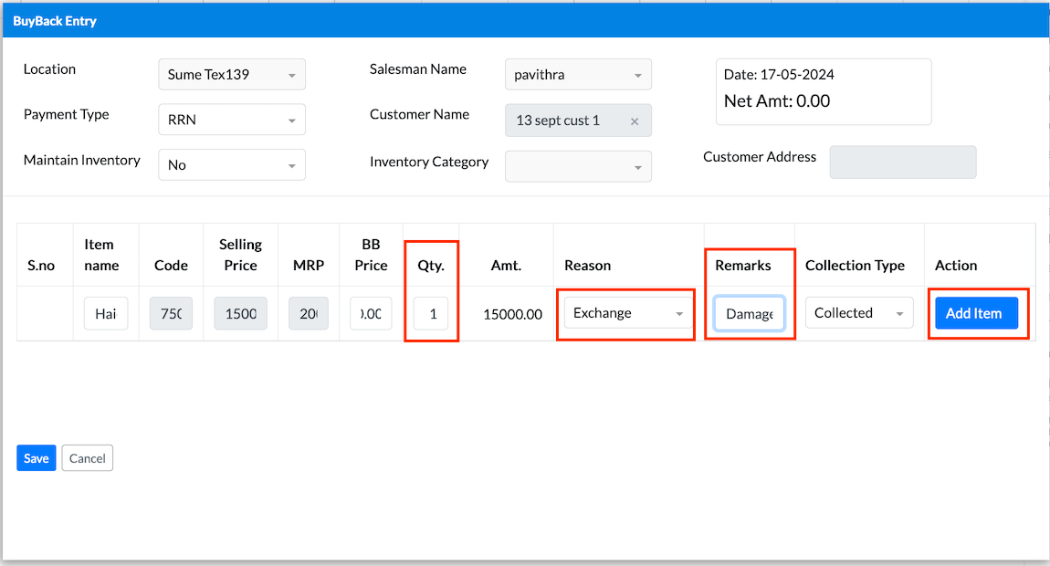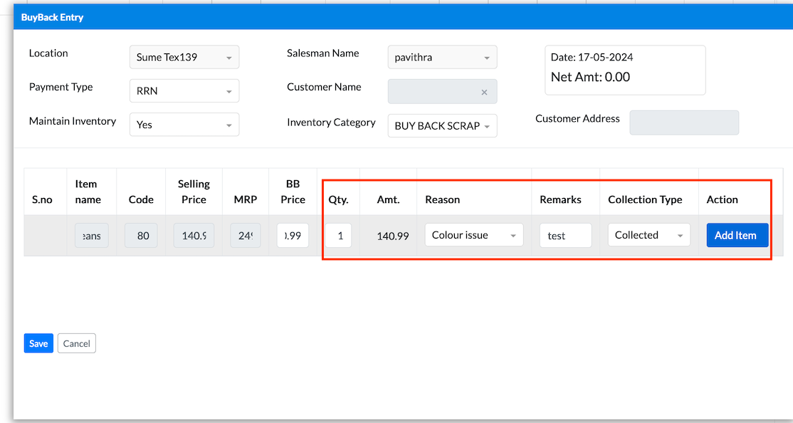 If you select the payment type as Cash, then you have to give Cash for the Buy back item.