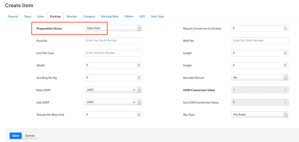 To do this, navigate to the Item Master screen. Then, under the Packing tab, the Preparation Status should be set to Open Item.