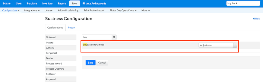 5. Then click Tools → Configuration → Business Configuration, check to see if the Buyback entry mode configuration is set to "Adjustment".