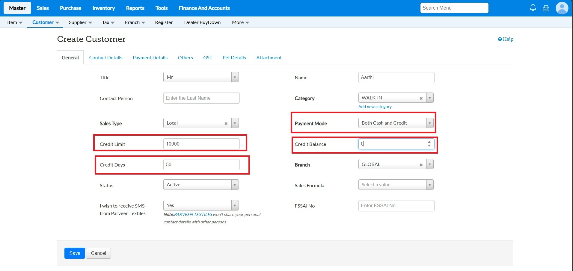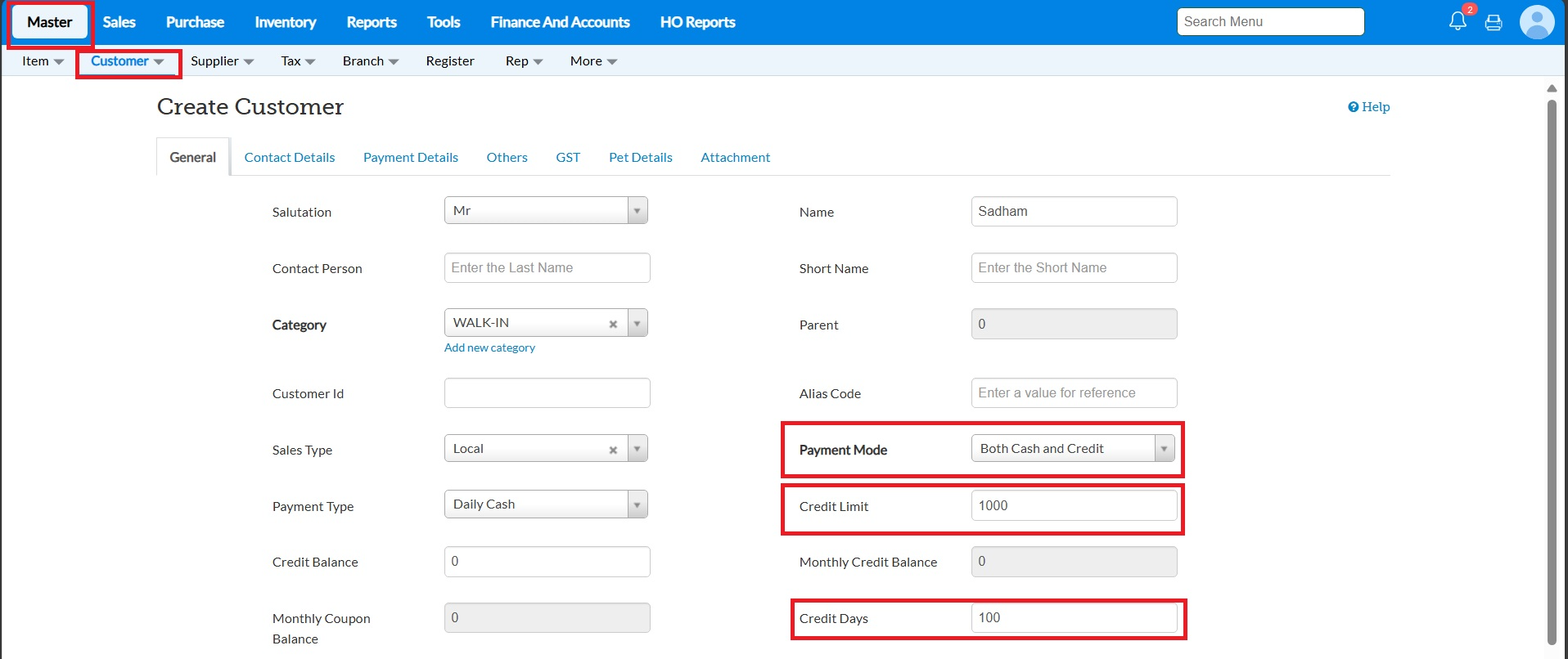 Enter the Credit Limit and Credit Days.