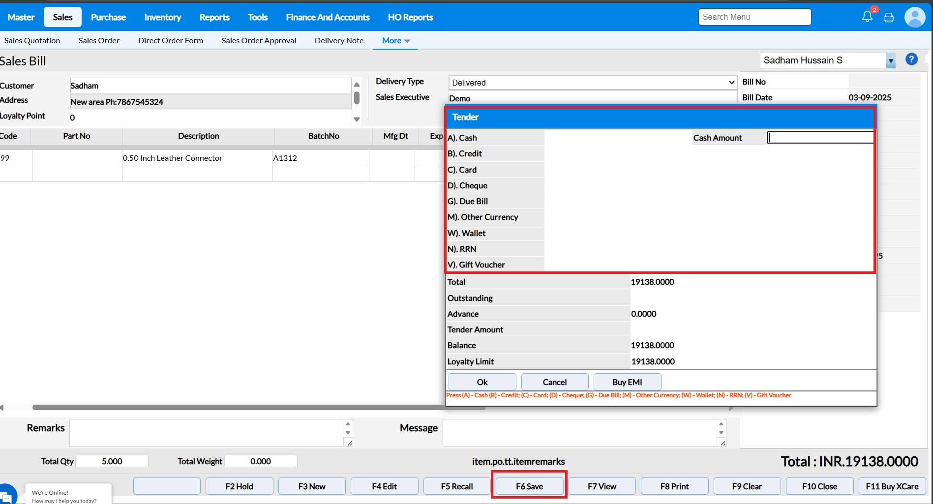 2. Either scan the Item Code or press ENTER or in Code to select from the pop-up screen.If required you can specify the Disc% or Bill Disc Amount (Cash Discount Amount).